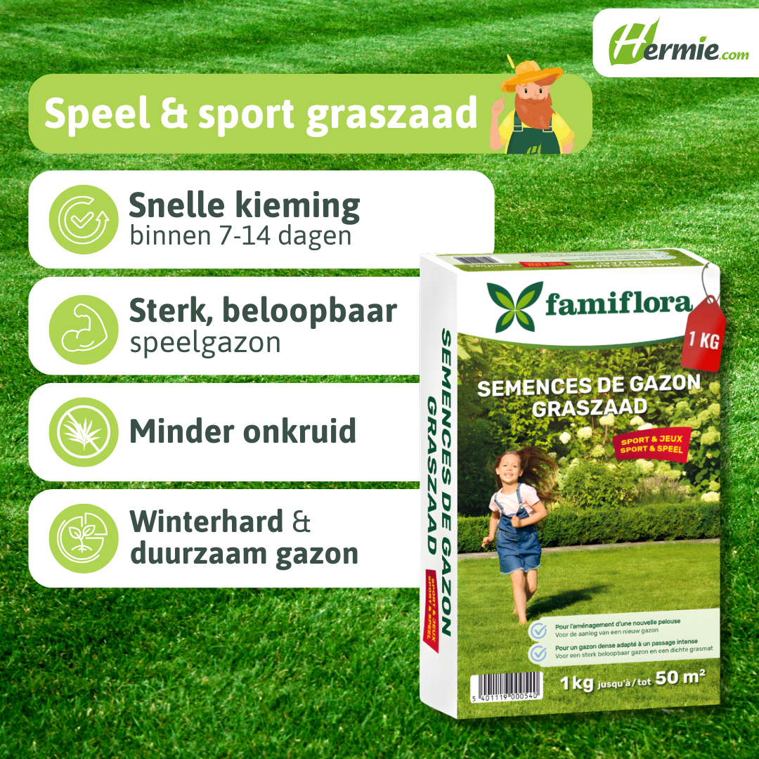 Famiflora Grass Seed Play & Sport est le choix idéal pour les familles qui veulent profiter de leur pelouse. Commandez dès aujourd'hui et créez une belle pelouse verte pour le sport et le jeu ! Et tout cela au meilleur rapport qualité-prix !