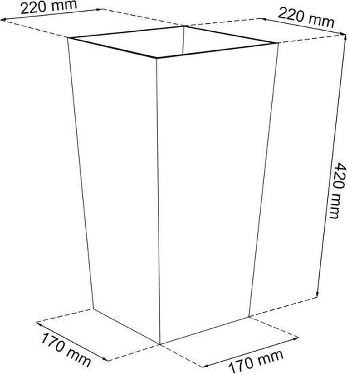 Productspecificaties: Vorm: Vierkant, hoog. Breedte: 22 cm, Lengte: 22 cm, Hoogte: 42 cm. Inhoud binnenbak: 8 liter (totale potcapaciteit: 16,3 liter). Kleur: Antraciet. Materiaal: Kunststof. Referentie: DURS225-S433.