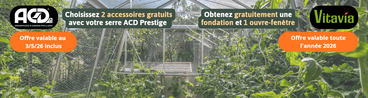 Composez ici la serre de vos rêves en ligne, avec toutes sortes d'options/accessoires/couleurs et un prix transparent ! Choisissez parmi nos serres en verre de haute qualité d'ACD et Vitavia ! De plus, elles sont livrées à votre porte, ce qui est pratique !