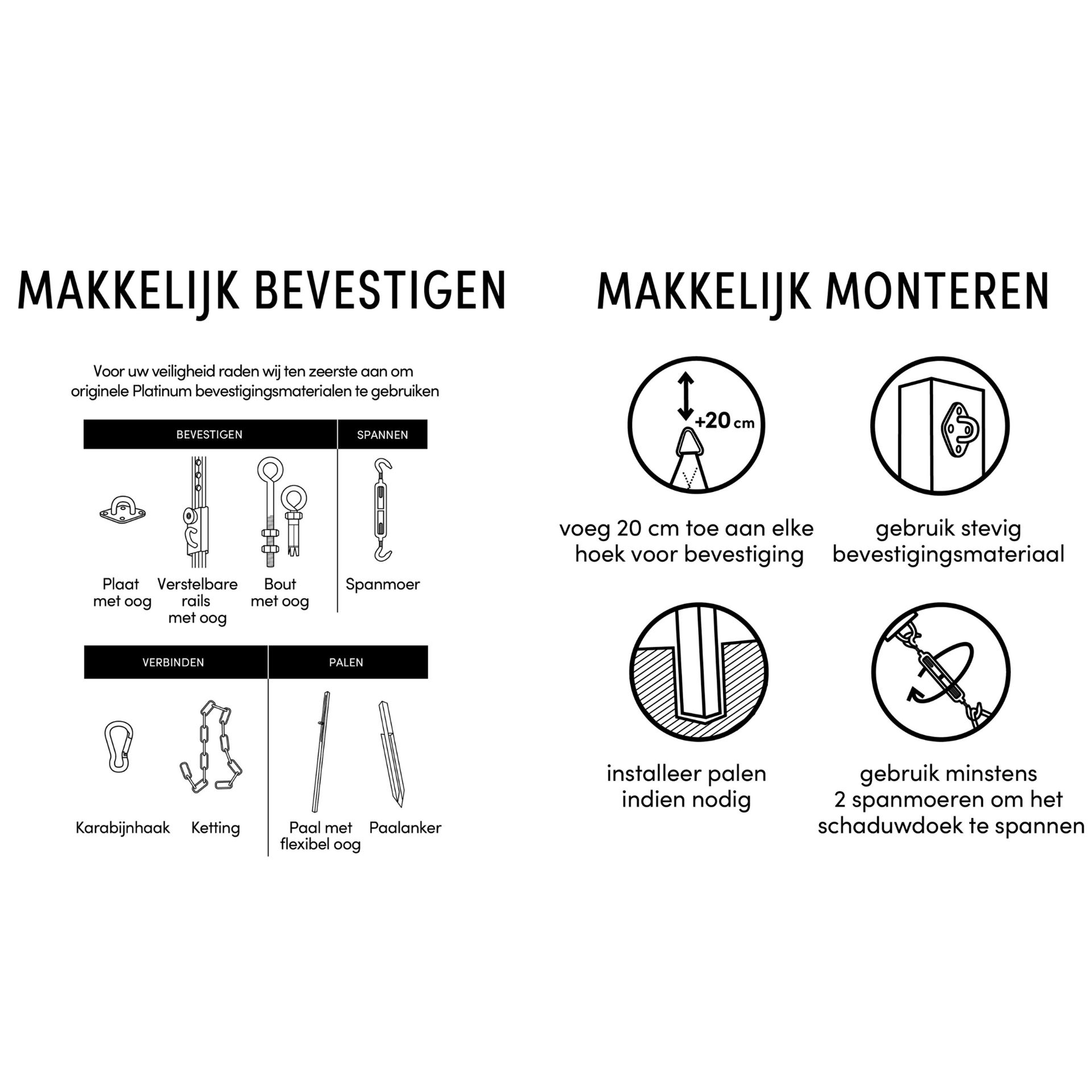 Nesling wordt Platinum!De schaduwdoeken van Platinum zijn niet zomaar schaduwdoeken; voorheen bekend onder het merk Nesling, hebben ze een gevestigde reputatie in kwaliteit en duurzaamheid. Elk detail is zorgvuldig overwogen om jouw buitenruimte te verrijken met een extra vleugje luxe. Het duurzame High Density Polyethyleen voor Deze schaduwdoeken en RVS voor de oogjes zijn slechts enkele voorbeelden van de hoogwaardige materialen die ze gebruiken.