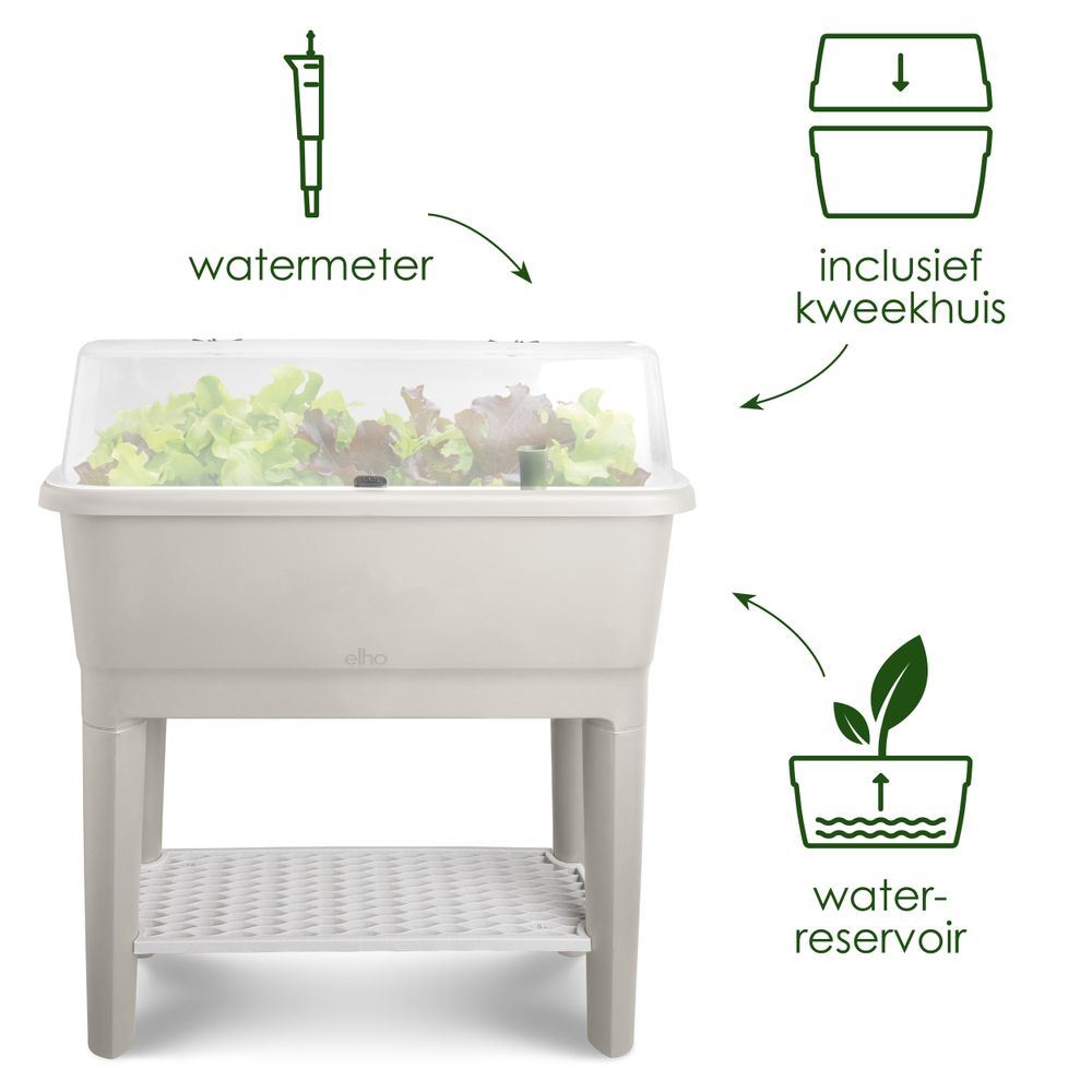 De kweektafel heeft een geintergreerd watersysteem inclusief een watermeter. Daarnaast komt deze kweektafel ook met een bijpassend kweekhuis en onder de tafel bevindt zich een handige tray. Deze kweektafel is gemaakt van 100% gerecycleerd plastic, geproduceerd met windenergie en ook nog eens 100% recycleerbaar. De kweektafel is daarnaast ook vorstbestendig en verkleurt niet.