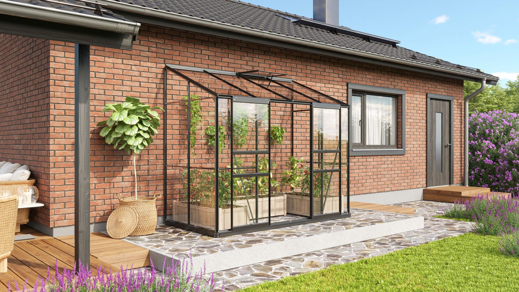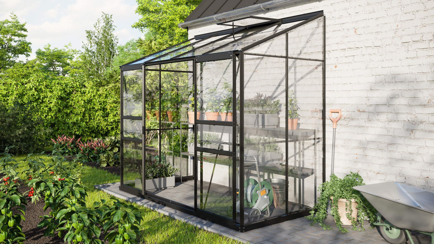 Wat de Ida-serie uniek maakt, is zijn veelzijdigheid en de aandacht voor detail in het ontwerp. De serres zijn uitgerust met handige schuifdeuren en een of twee dakramen, afhankelijk van het model, wat zorgt voor een efficiënte ventilatie en eenvoudig toegang. De standaard regengoot zorgt ervoor dat je gemakkelijk regenwater kunt opvangen en hergebruiken. Deze serie serres vereist een stevige achterwand zoals een huis- of tuinmuur, waardoor ze stabiel en veilig geplaatst kunnen worden.