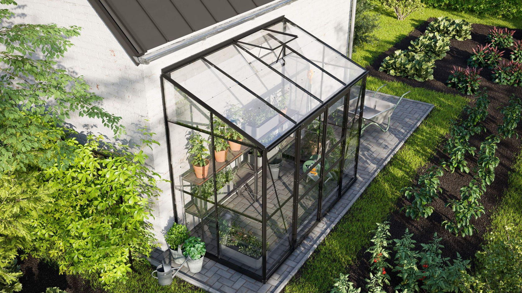 De Vitavia Ida-serie is een slimme oplossing voor tuinliefhebbers met beperkte ruimte. Deze serre is ontworpen om tegen een muur te worden geplaatst en biedt ondanks zijn compacte formaat volop ruimte voor de teelt van kruiden en groenten, evenals het overwinteren van grotere potplanten. Dankzij de volledige stahoogte kun je comfortabel werken, zelfs in een kleine tuin, op een balkon of terras.