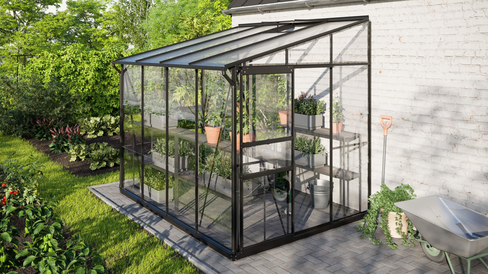 Wat de Ida-serie uniek maakt, is zijn veelzijdigheid en de aandacht voor detail in het ontwerp. De serres zijn uitgerust met handige schuifdeuren en een of twee dakramen, afhankelijk van het model, wat zorgt voor een efficiënte ventilatie en eenvoudig toegang. De standaard regengoot zorgt ervoor dat je gemakkelijk regenwater kunt opvangen en hergebruiken. Deze serie serres vereist een stevige achterwand zoals een huis- of tuinmuur, waardoor ze stabiel en veilig geplaatst kunnen worden.