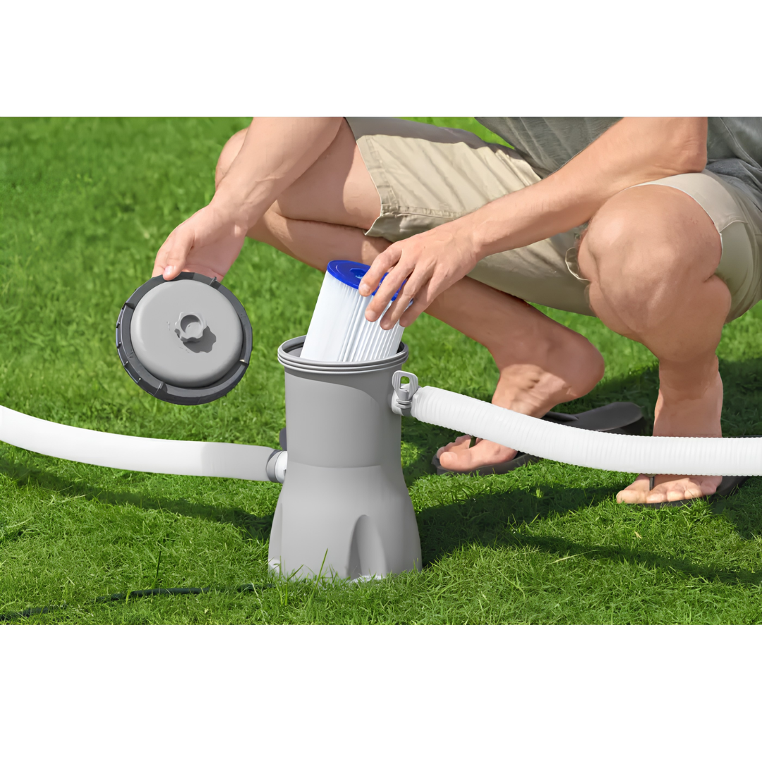 Bij dit zwembad hoort natuurlijk ook een reinigende filter, zo blijft je zwembad heerlijk schoon. Dit zwembad wordt geleverd met een patroonfilterpomp met capaciteit 3.028 L/u. Deze filterpomp werkt op filterpatronen van het type II. Vervang de cartridges regelmatig zodat de pomp het water optimaal kan filteren.