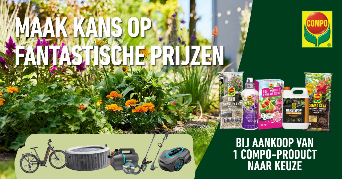 Het gazon maaien, de grasboorden afsteken, de planten watergeven, hier en daar uitgebloeide bloemen verwijderen, bemesten - na het werk in de tuin kijk je ongetwijfeld uit naar wat welverdiende ontspanning! COMPO kan je daar misschien bij helpen : bij aankoop van 1 COMPO-product maak je namelijk kans op leuke prijzen gaande van een Intex-jacuzzi waarin je volledig tot rust komt tot een elektrische fiets voor een heerlijk toertje in de natuur. Of wat dacht je van een praktische Gardena AI-gestuurde robotmaaier, een handige heggenschaar, trimmer of een besproeiingspomp die jouw tuinwerk verlichten?