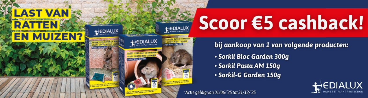 Koop ratten- en muizengif uit het Sorkil-assortiment van Edialux tussen 01/06/25 en 31/12/25 en geniet tijdelijk van €5 cashback op het aankoopbedrag.