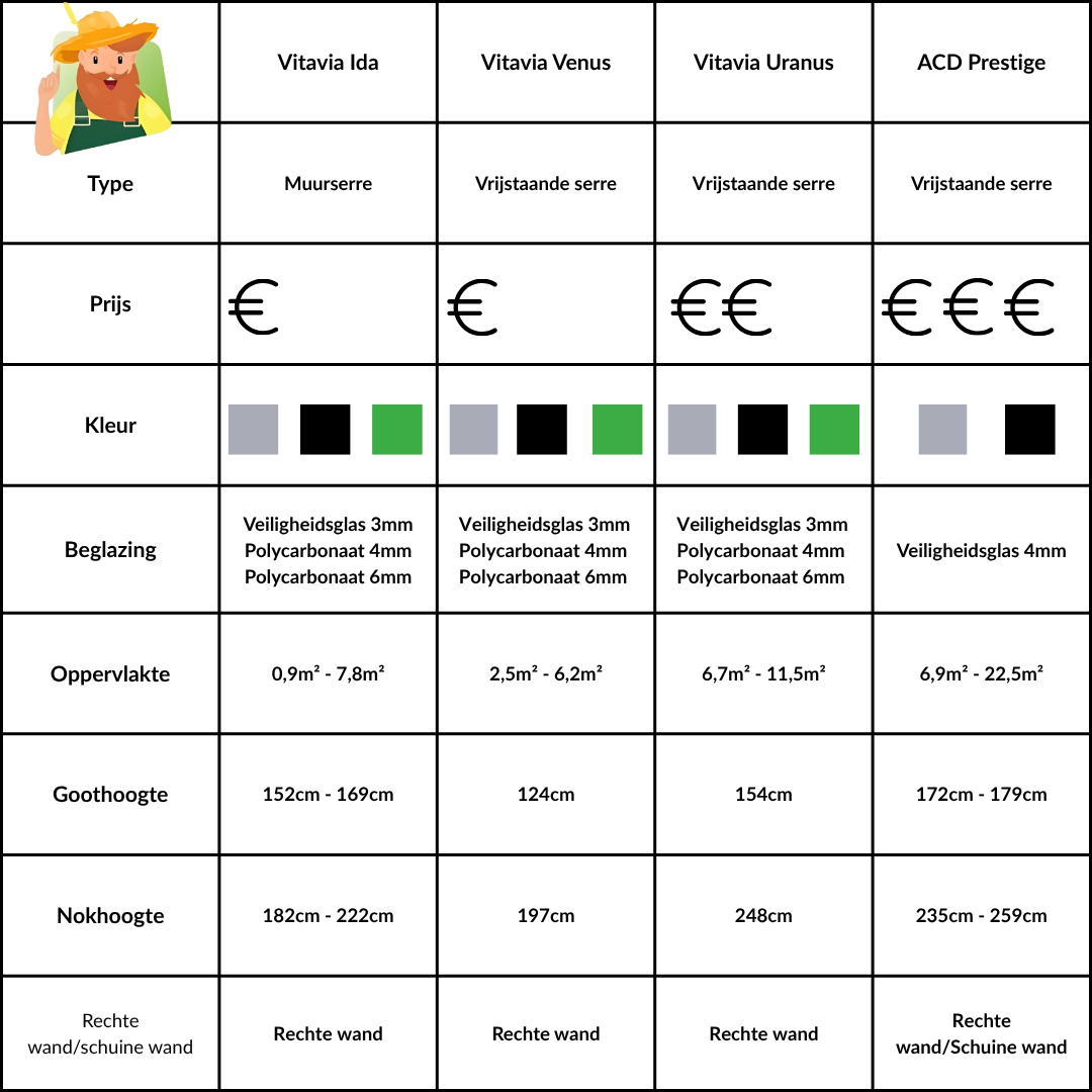 | Glazen serres (veiligheidsglas) | Klassieke uitstraling, goede lichtdoorlaatbaarheid, duurzaam | Hogere kostprijs, glas kan breken | Voor doorgewinterde moestuiniers |