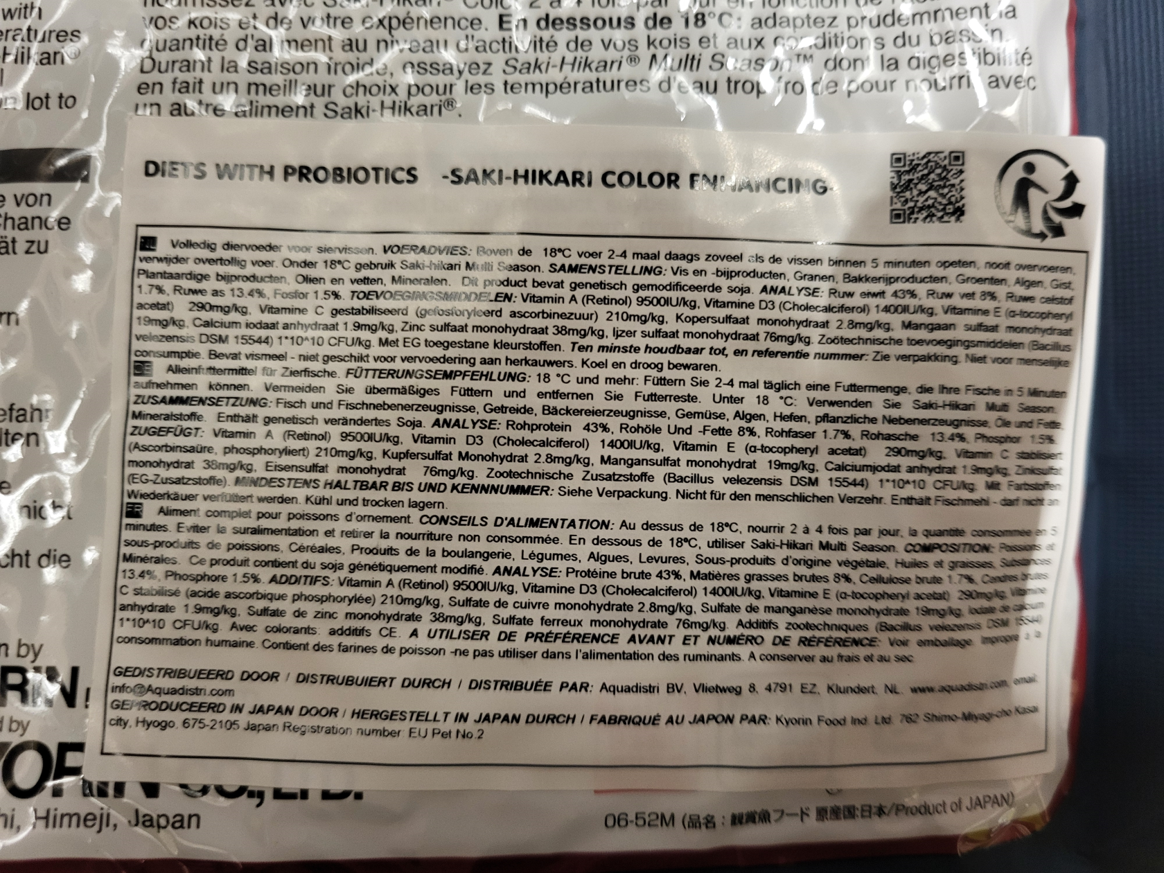 Composition and nutritional values: Complete animal feed for ornamental fish. Composition: Fish and by-products, Cereals, Bakery products, Vegetables, Algae, Yeast, Vegetable by-products, Oils and fats, Minerals. This product contains genetically modified soy. Analysis: Crude protein 43%, Crude fat 8%, Crude fiber 1.7%, Crude ash 13.4%, Phosphorus 1.5%. Additives: Vitamin A 9500IU/kg, Vitamin D3 1400IU/kg, Vitamin E 290mg/kg, Vitamin C stabilized 210mg/kg, Copper sulfate 2.8mg/kg, Manganese sulfate 19mg/kg, Calcium iodate 1.9mg/kg, Zinc sulfate 38mg/kg, Iron sulfate 76mg/kg. Zootechnical additives (Bacillus velezensis DSM 15544) 1*10^10 CFU/kg. With EC permitted colorants. Not for human consumption. Contains fishmeal - not suitable for feeding to ruminants. Store cool and dry.