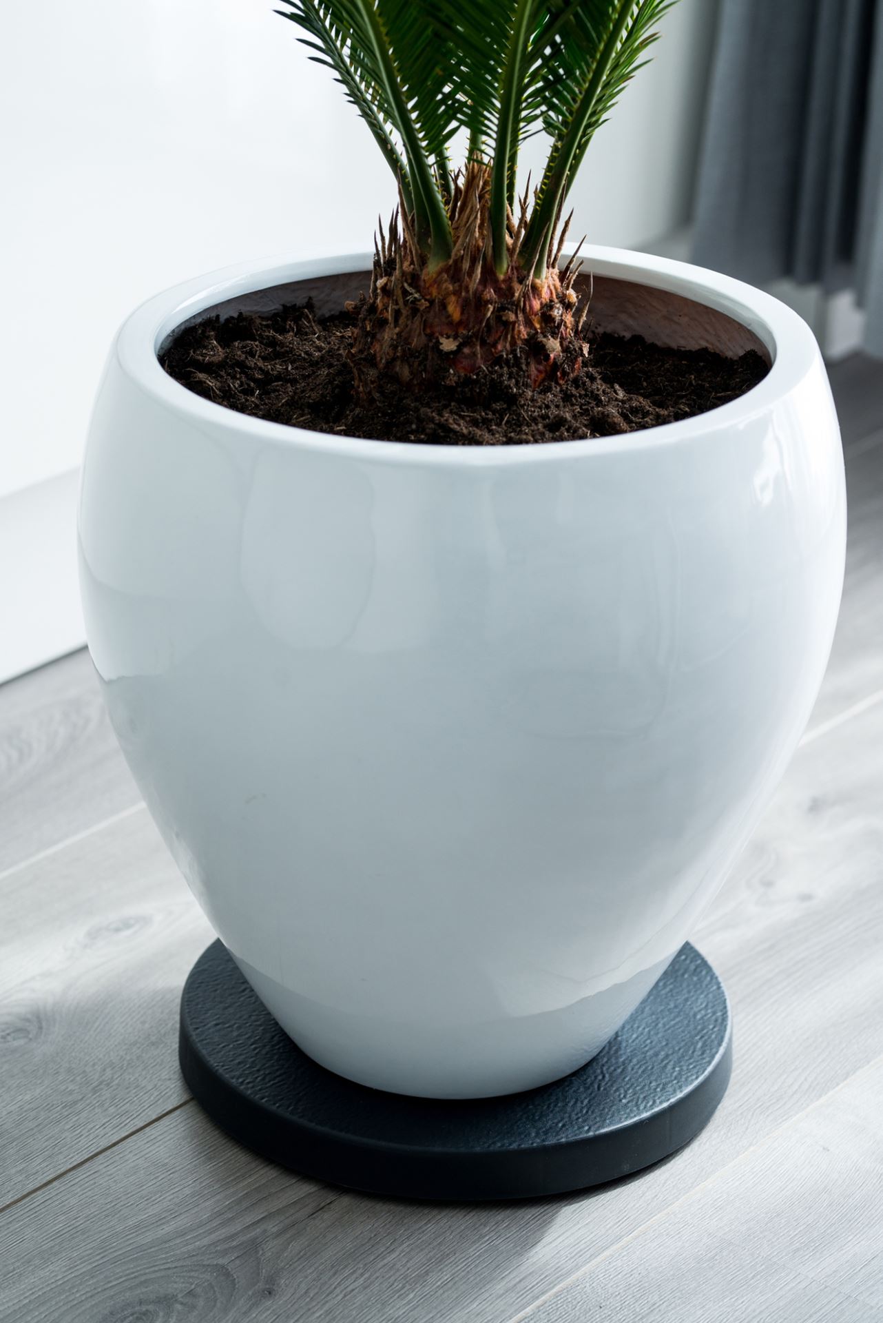 Round plant trolley from Nature, made of polypropylene with 4 wheels made of polyamide. The top is 4cm thick and has a slate color. The four wheels have a diameter of 20mm and are individually 360° rotatable so it can move the trolley in any direction. There are 3 additional supporting rollers in each wheel for optimal swivelability. The trolley has a maximum load of 40kg and is suitable for indoor use. Size: H 4cm, diameter 29cm.