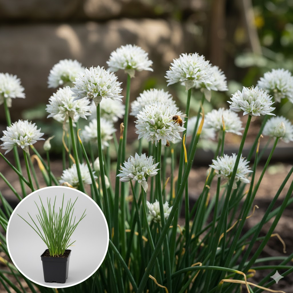 Chinese chives have been used in Asian cuisine for centuries. The leaves are coarser and broader than the common chive. Because of its garlicky taste it is also called garlic chives, with the advantage that you do not smell it after eating. The plant blooms in summer with white flowers.