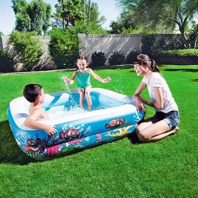 This inflatable pool features a fun ocean print showing colorful fish & coral. Your little one will feast his eyes (or better goggles!) on it. 🤿