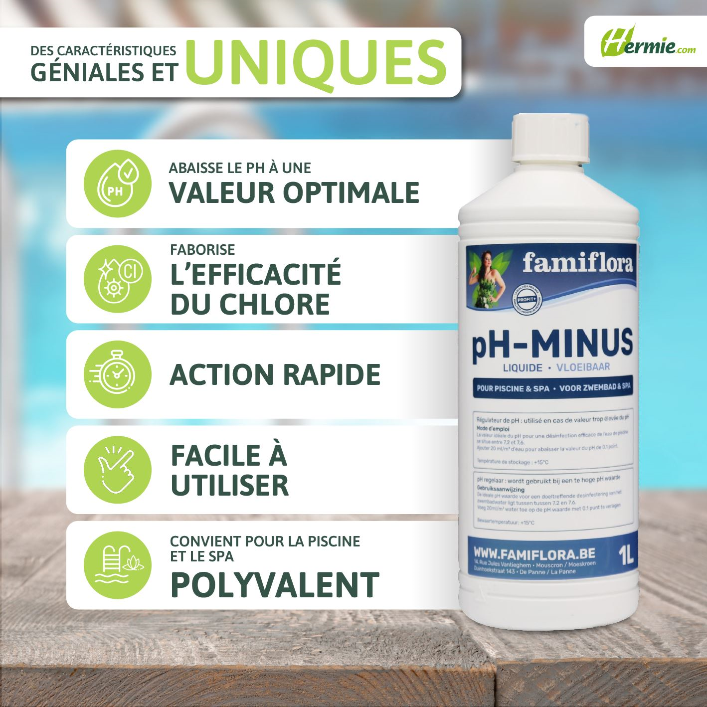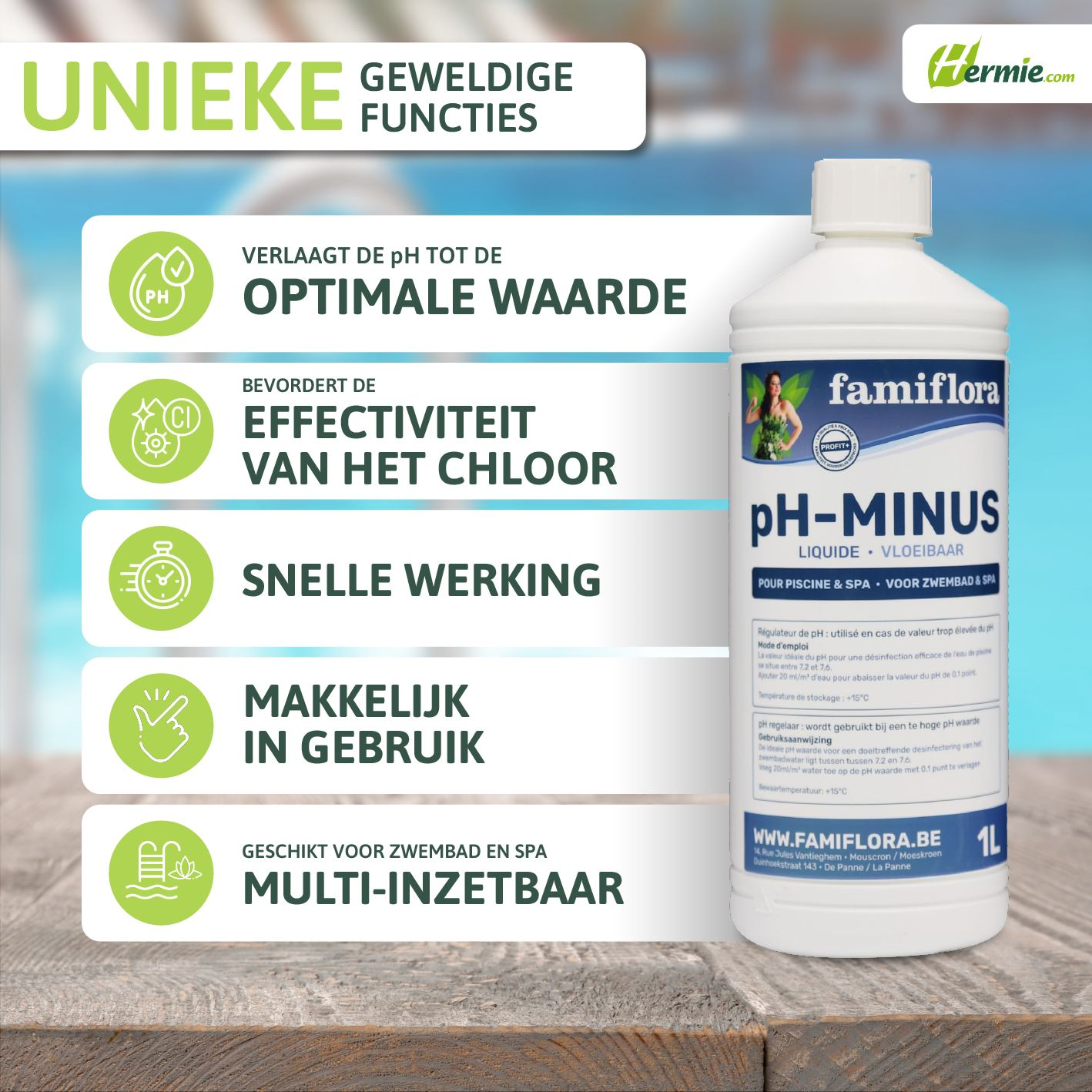 This liquid Famiflora pH-minus lowers the pH level of your pool or spa. This keeps the pool values at the right level! 🏊