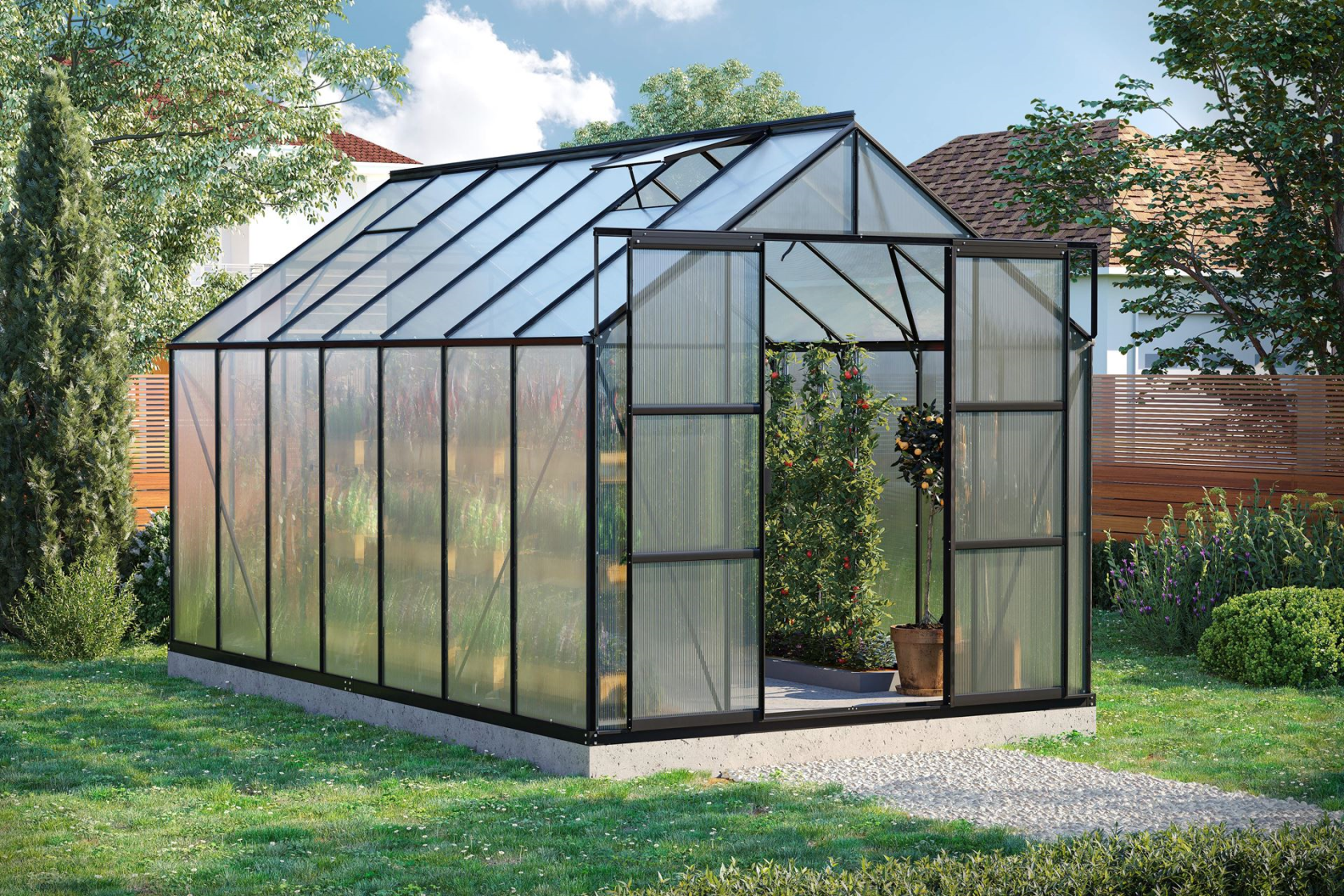 Vitavia Uranus greenhouse 11.5m² with 6 mm polycarbonate - Black - With double sliding door (W120 cm) and foundation