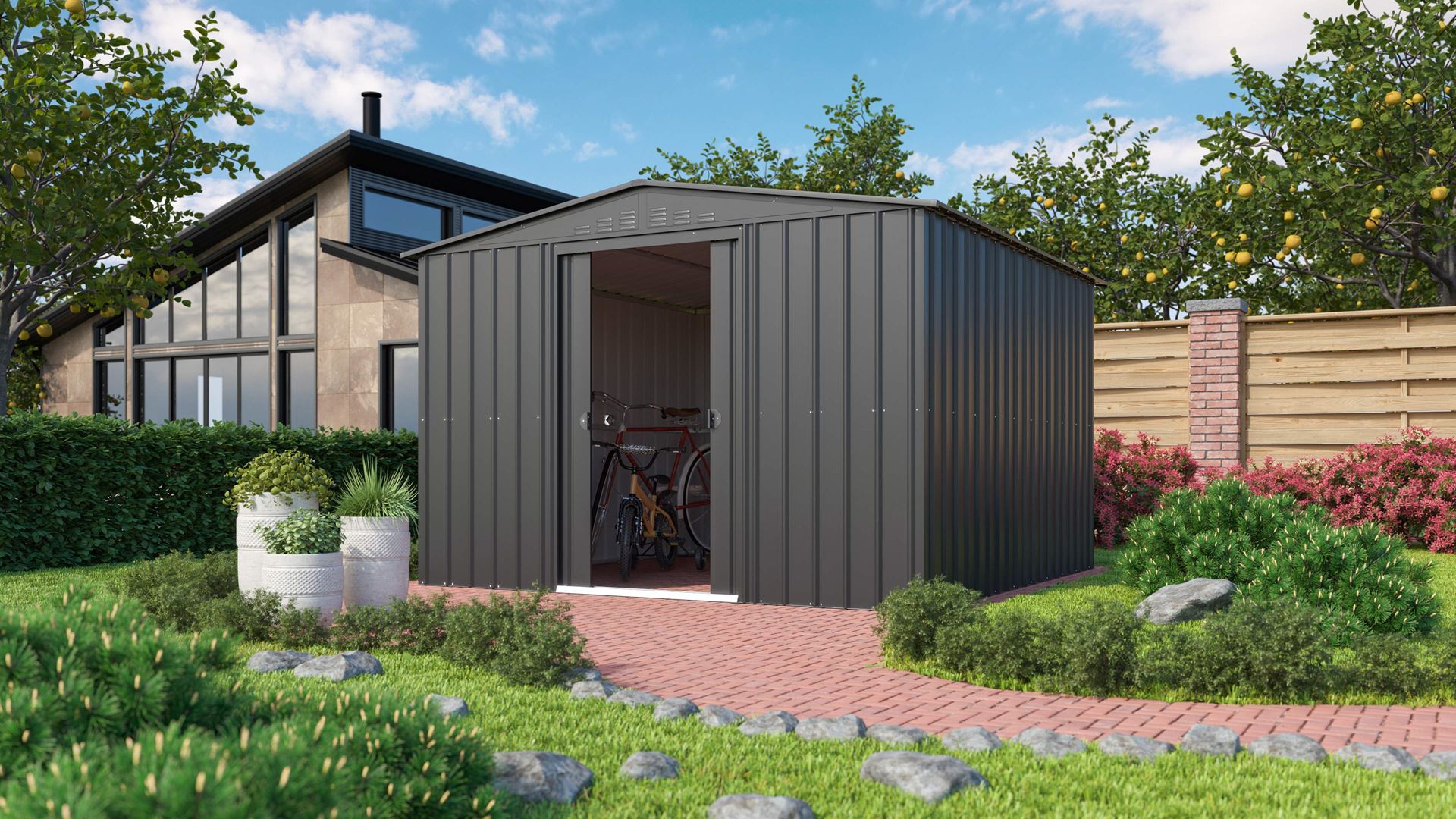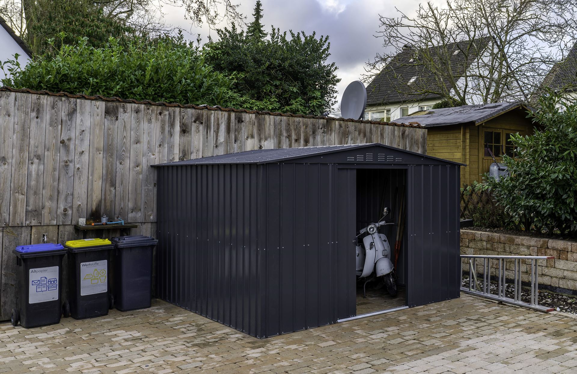 With the premium tool shed Dream, hobby gardeners, garden and home owners organize their garden with ease and comfortEven in its smallest dimensions with a height of almost two meters and a 1.70 m high double door, it offers freedom of movement and effortless access to lawn mower, snow shovel and so on - and thanks to thesliding doors even when the snow is directly in front of the door. For protection against unwanted visitors, the doors are prepared fora padlockAs with all metal tool sheds from Globel, garden and home owners can rely on superior stability, fully hot-dip galvanized steel and high-quality workmanship fromprofiles and surfaces with the Dream.The Dream is available in five sizes from 2.46 to 8.82 m² and in three colors, and is supplied as a kit without a floor. With optional accessories such as translucent roof panels and side windows,owners of the premium tool shed can further upgrade their garden manager.