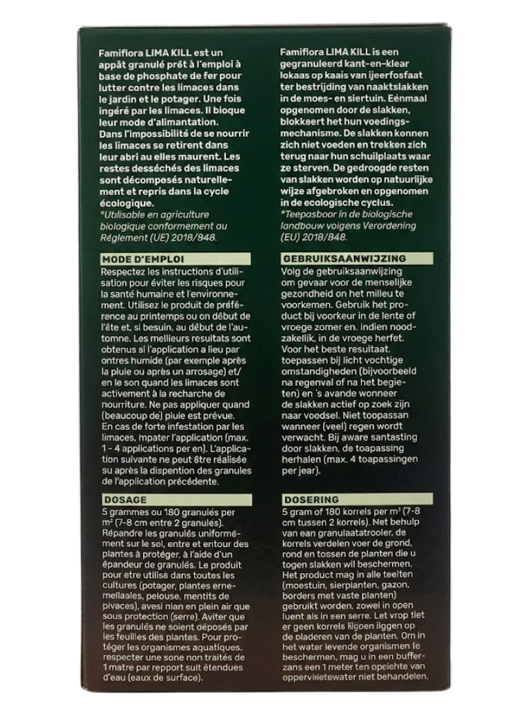 Are your lovingly grown cabbage lettuce and beautiful dahlias also always attacked by uninvited guests? 🐌 With Famiflora LIMA KILL, you put an end to slug infestation in your vegetable and ornamental garden in an effective and responsible way. This granulated, ready-to-use bait based on iron phosphate stops the infestation at lightning speed. Once the slugs eat the pellets, their feeding mechanism is blocked. They then retreat to their hiding place to die, so you won' t find any slime trails or dead slugs in your garden. Moreover, this product is safe to use in organic farming (in accordance with EU Regulation 2018/848)! 🌱