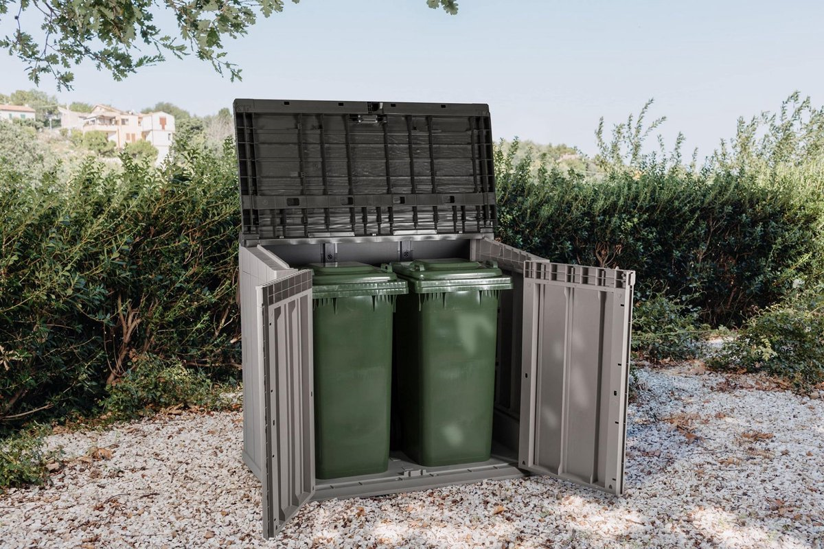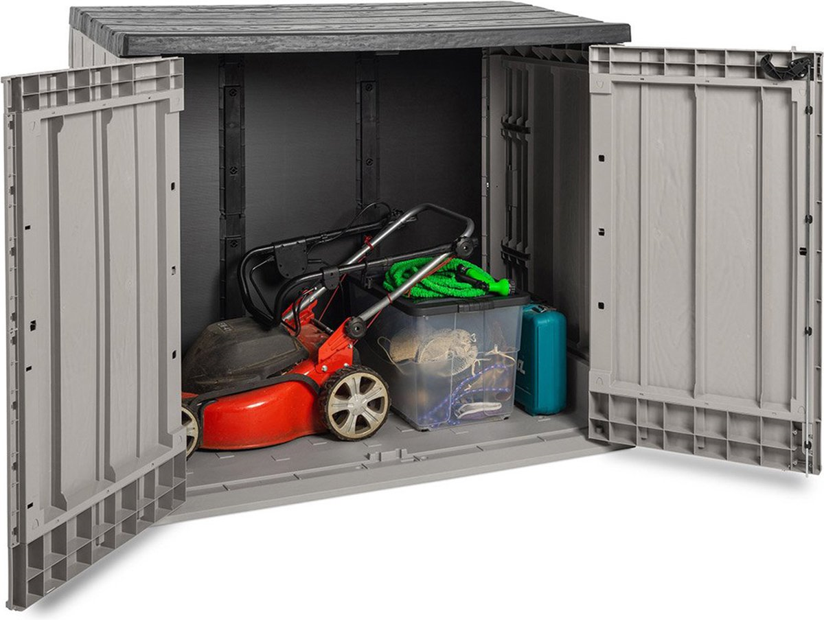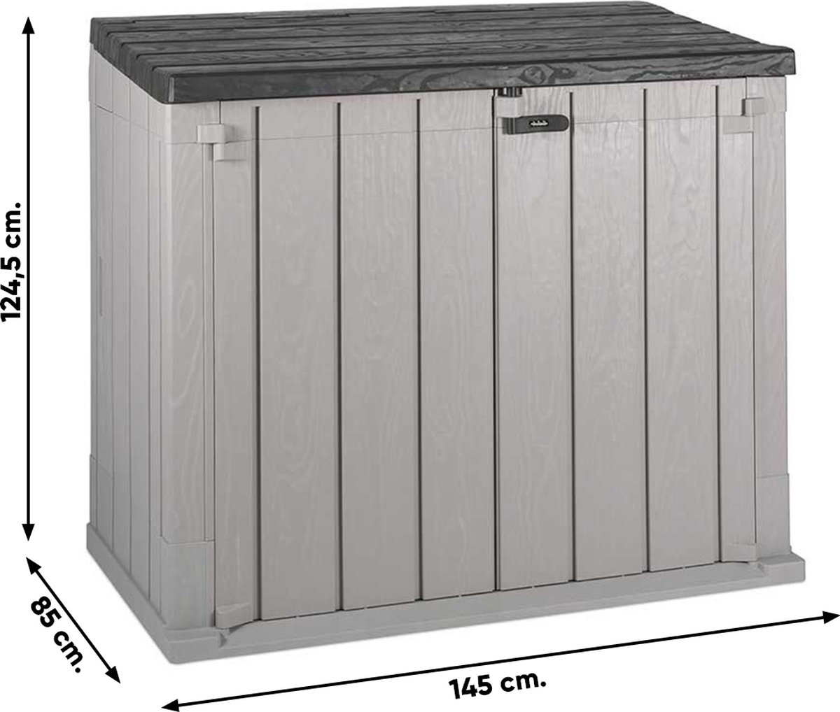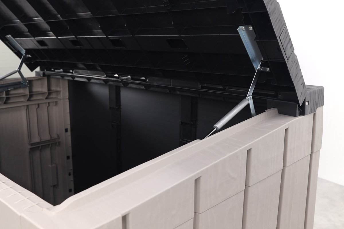 Do you have a sizeable garden and therefore also need serious storage space? The Toomax Stora Way Plus XL with a gigantic capacity of 1270 liters is the absolute big winner when it comes to keeping your outdoor space neat and organized. This multipurpose, sturdy garden closet in a stylish taupe-gray color is specially designed to keep large objects effortlessly out of sight. Whether it's piles of thick lounge cushions, heavy garden tools, or even two 120-liter trash containers; this storage unit swallows it all with ease.