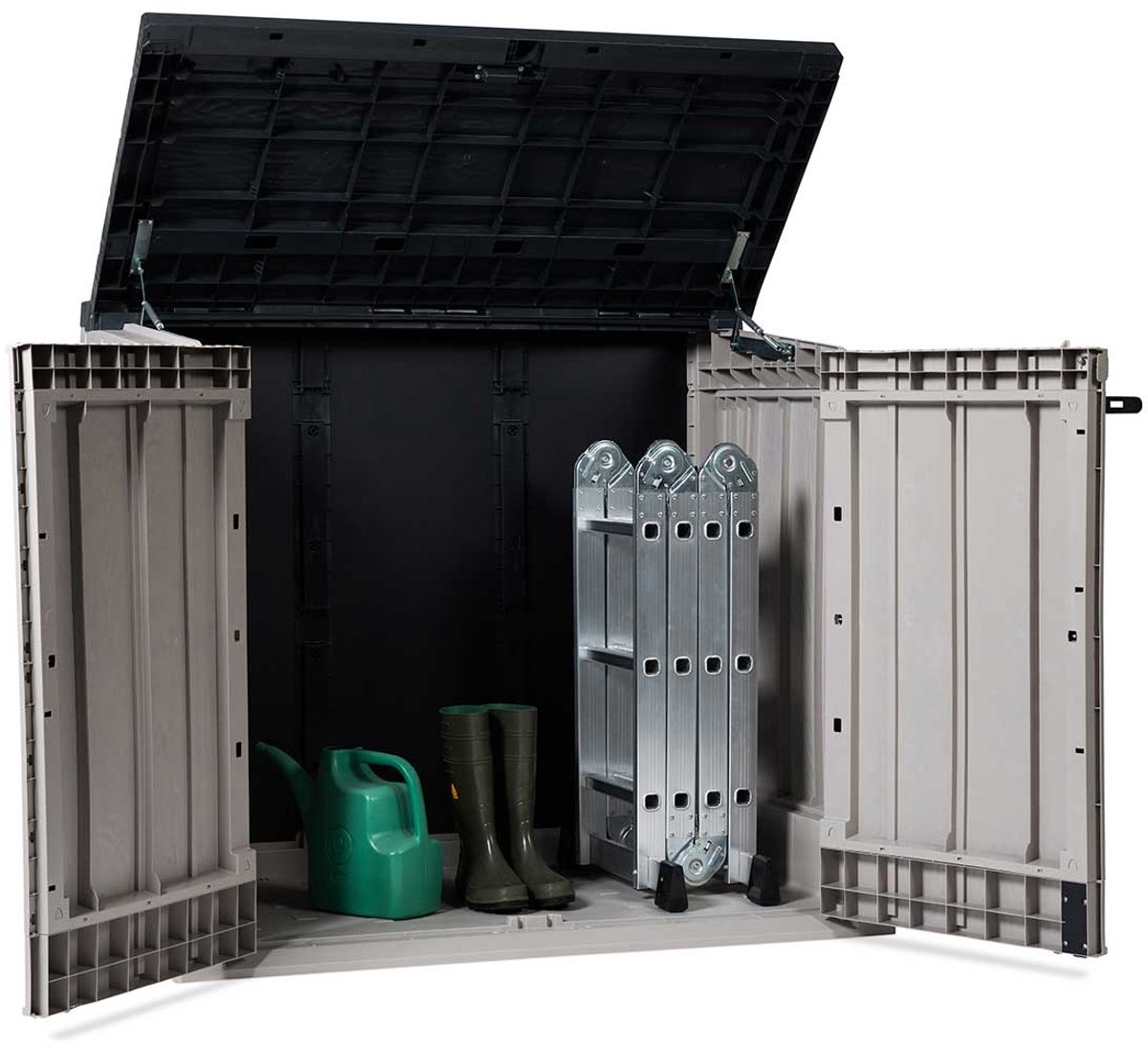 - Extremely accessible design: Thanks to the two wide-opening doors in the front and the convenient hinged lid at the top, you'll never have to dig or lift heavily to get to your stuff.