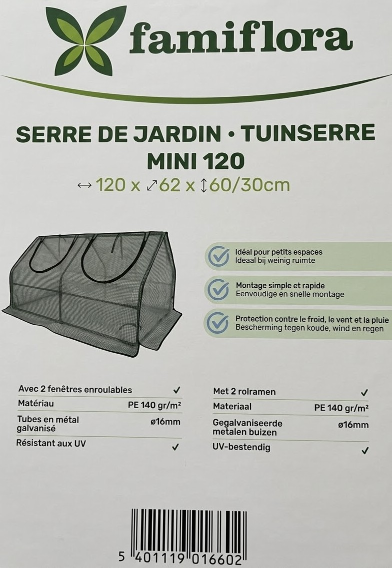 Want to start growing easily or give your young plants extra protection? This compact 120 x 62 x 60 cm greenhouse is the ideal solution for those who want smart gardening on a small scale. Perfect for your patio, balcony or kitchen garden.