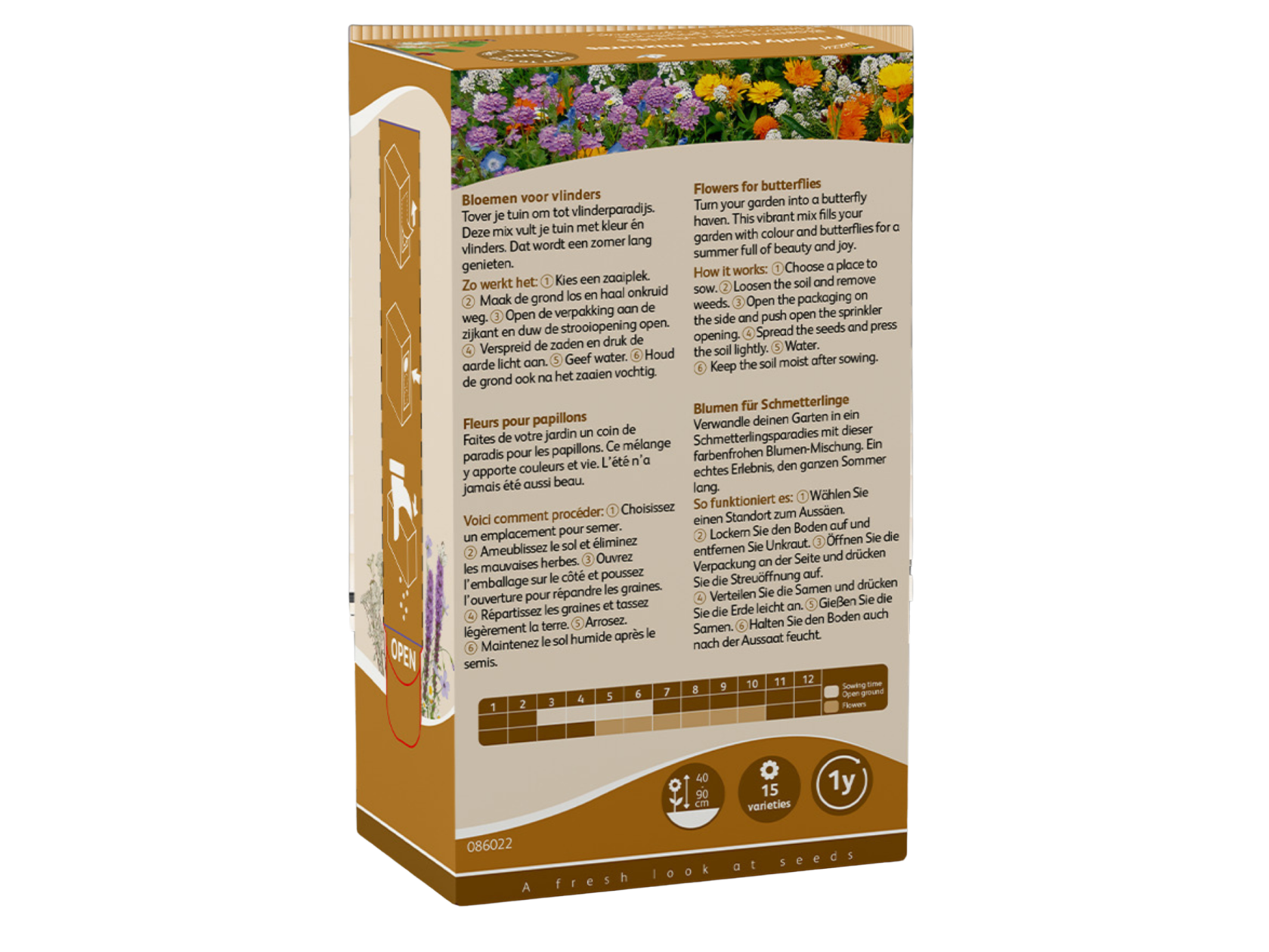 Prefer to see butterflies flutter gracefully throughout your garden? With the Buzzy® Spread Box Friendly Flowers Butterflies Low, you'll turn your outdoor space into an absolute paradise for these beautiful insects! 🦋 This annual, flower-rich mixture contains 15 varieties of flowers that stay a little lower to the ground. They fill your sunny garden with brilliant colors and a delicious nectar that butterflies love to attract. That will be a summer to enjoy from your terrace. With this handy box you can effortlessly scatter 15 square meters.