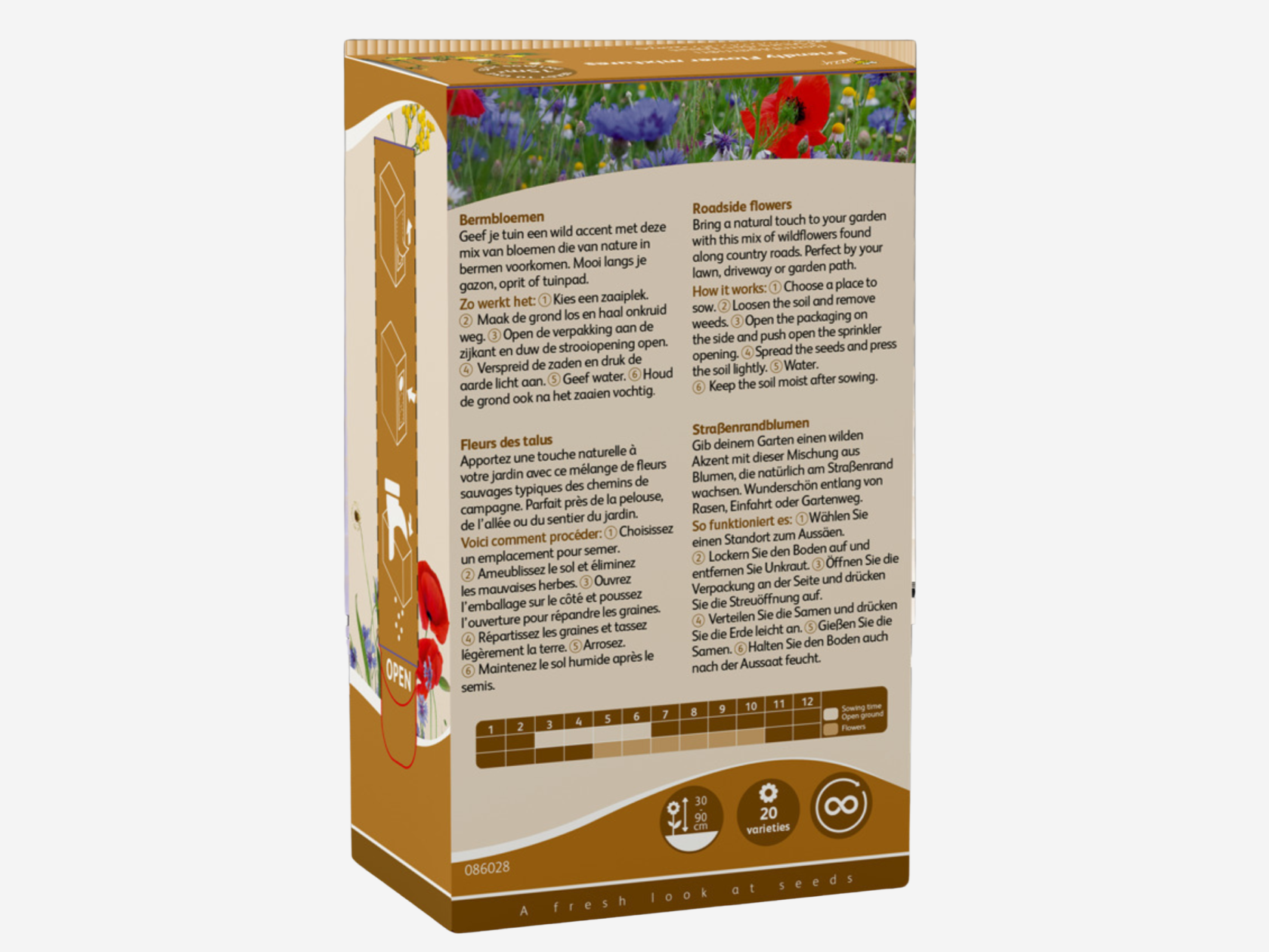 Do you long for that cheerful, uncultivated feeling of a blooming summer roadside, but just in your own garden? With the Friendly Flowers Roadside Mix Spread Box, it's a piece of cake! This balanced mix contains as many as 20 different species of annual flowers that grow naturally along fields and roads. Ideal for colorfully filling in that empty strip of ground along the driveway, garden path or lawn. 🌾