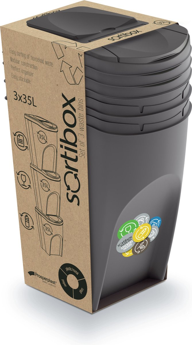 Heb je in huis of op de zaak flink wat afval om te scheiden? ♻️ Dan is deze grote Prosperplast Sortibox set van 3x 35 liter jouw ultieme oplossing! In deze robuuste steengrijze bakken kun je aanzienlijk meer kwijt dan in de standaard modellen. Het fantastische is: ze nemen dankzij hun slimme ontwerp nauwelijks meer vloeroppervlakte in! 🏢