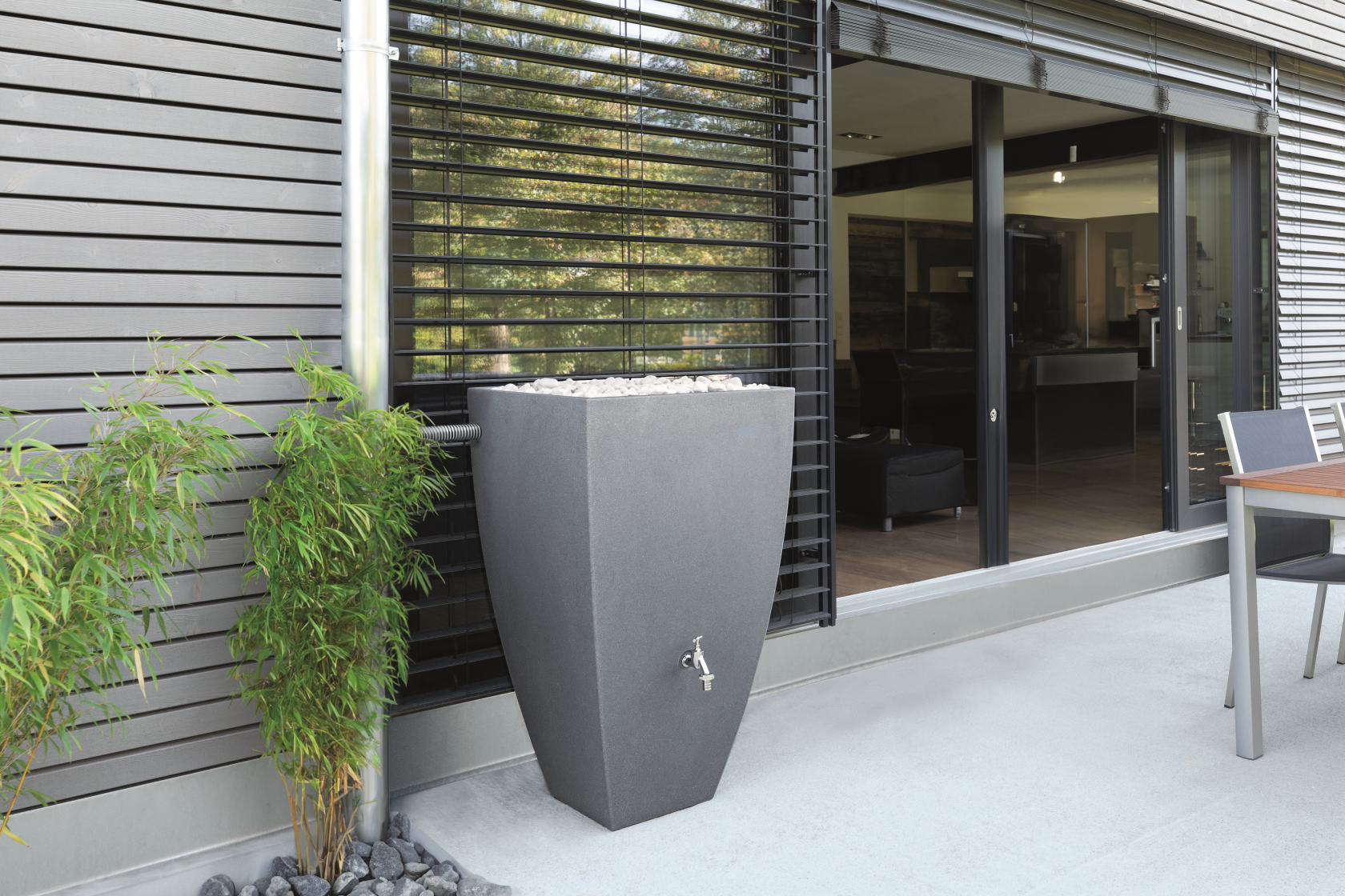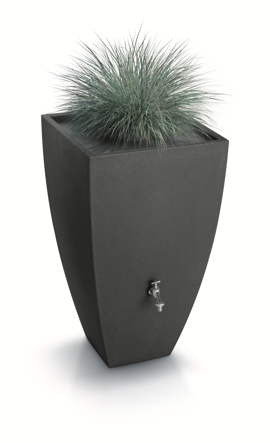 Store rainwater in style with this sleek, modern dark stone-look rain barrel!