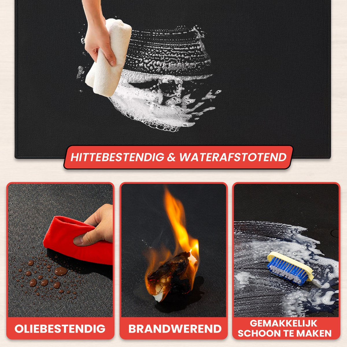 - Benefit 1: The mat is made of high-quality material that is not only heat-resistant and fireproof, but also effectively repels water and oil.