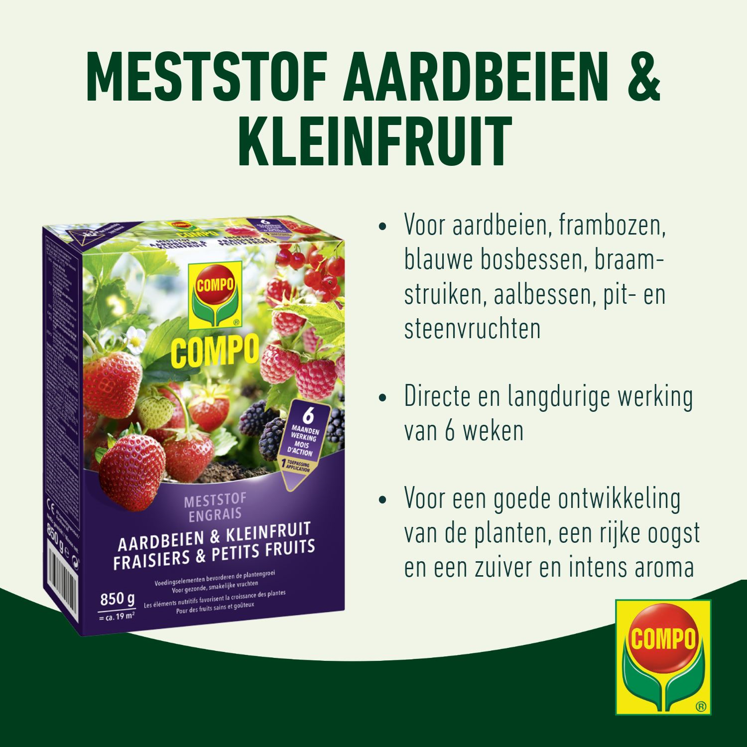 Each pellet of COMPO Fertilizer Strawberries & Small Fruit contains an ideal mix of nitrogen, phosphate and potassium for healthy plant growth, firm fruit formation and increased resistance to drought and disease. The extra portion of magnesium et potassium - in combination with other trace elements - ensure an intense and pure aroma.