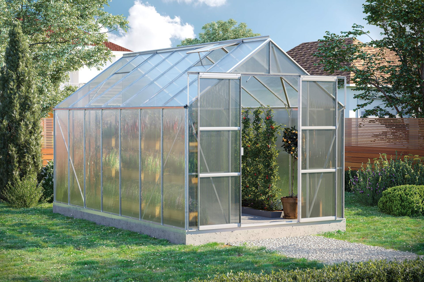 Informations sur le produit "Serre Vitavia Uranus 11.5m² avec polycarbonate 4 mm - Aluminium - Avec double porte coulissante (L120 cm) et fondation"