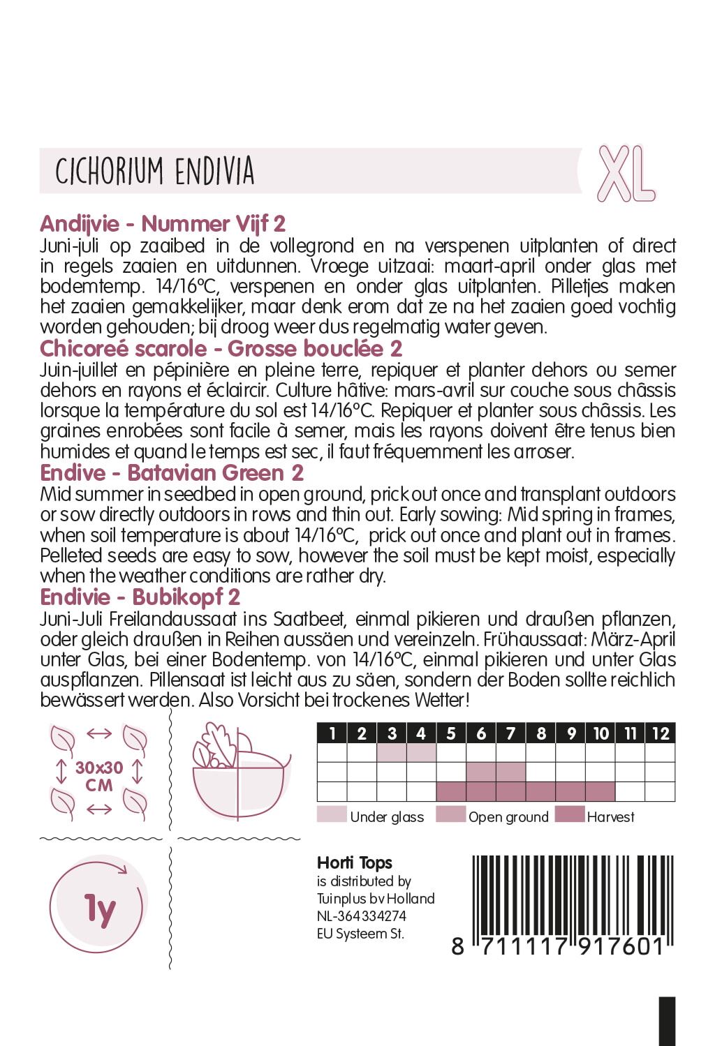 L'endive se sème de préférence en juin ou juillet dans un lit de semences au jardin, pour être repiquée après le repiquage. Il est également tout à fait possible de semer les plants directement en ligne et d'éclaircir si nécessaire. Pour une récolte précoce, semez dès mars ou avril dans une serre avec une température du sol de 14/16ºC. Après repiquage, la plante peut être plantée en serre. Les semis peuvent être plus faciles, mais il faut veiller à ce qu'ils restent suffisamment humides après le semis. Par temps sec, il est important d'arroser régulièrement.