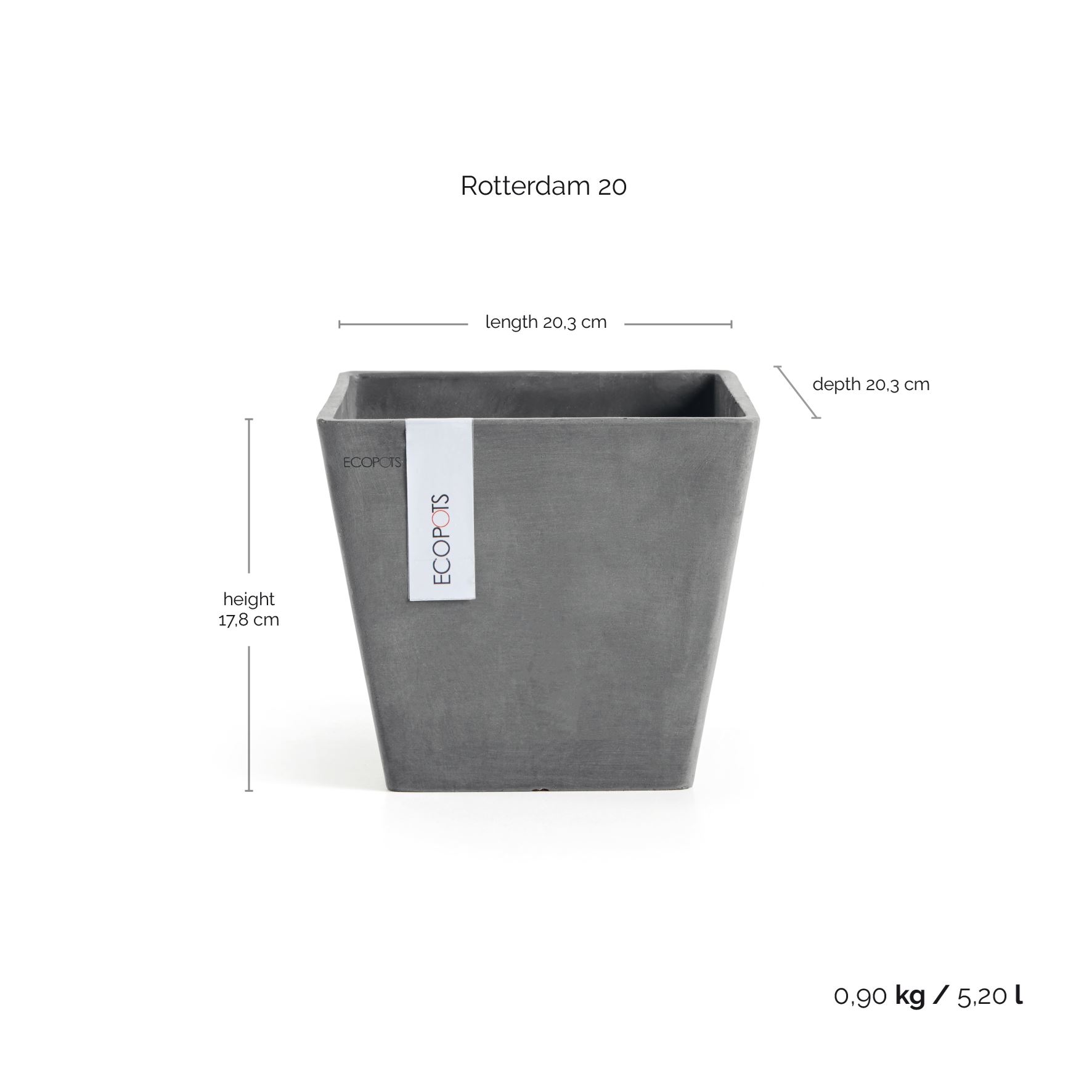 Informations sur le produit "Ecopots Rotterdam 20 - Gris - 20,3 x H17,8 cm - Pot de fleurs gris carré / jardinière"