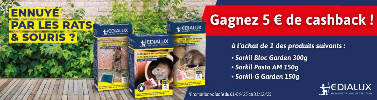 Achetez du poison contre souris et rats de la gamme Sorkil d'Edialux entre le 01/06/25 et le 31/12/25 et bénéficiez temporairement d'un cashback de 5 € sur le prix d'achat.