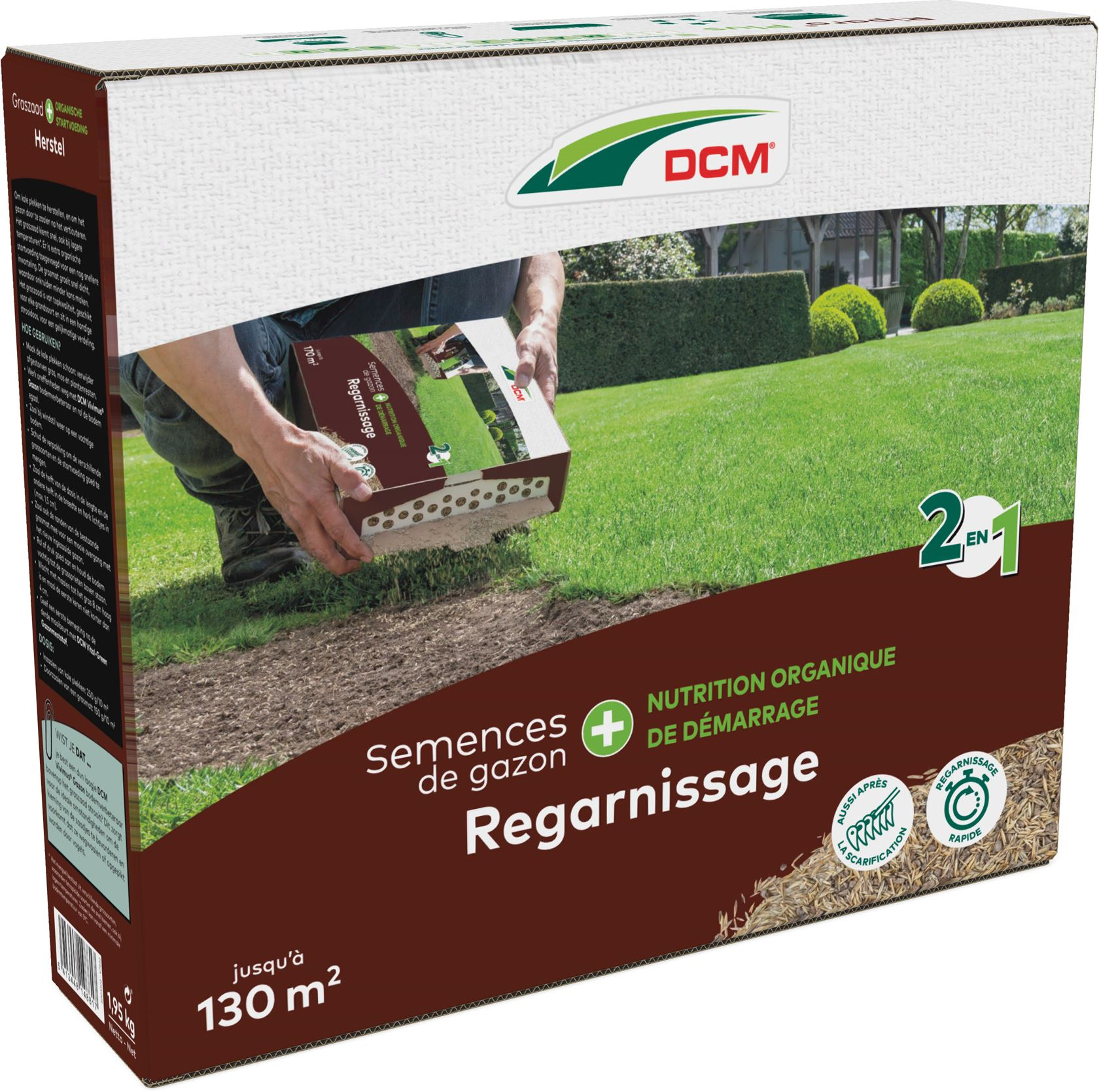 Productinformatie "DCM graszaad 1,95kg tot 130m² - 2-in-1 Herstel Plus incl. organische startvoeding - kale plekken herstellen"