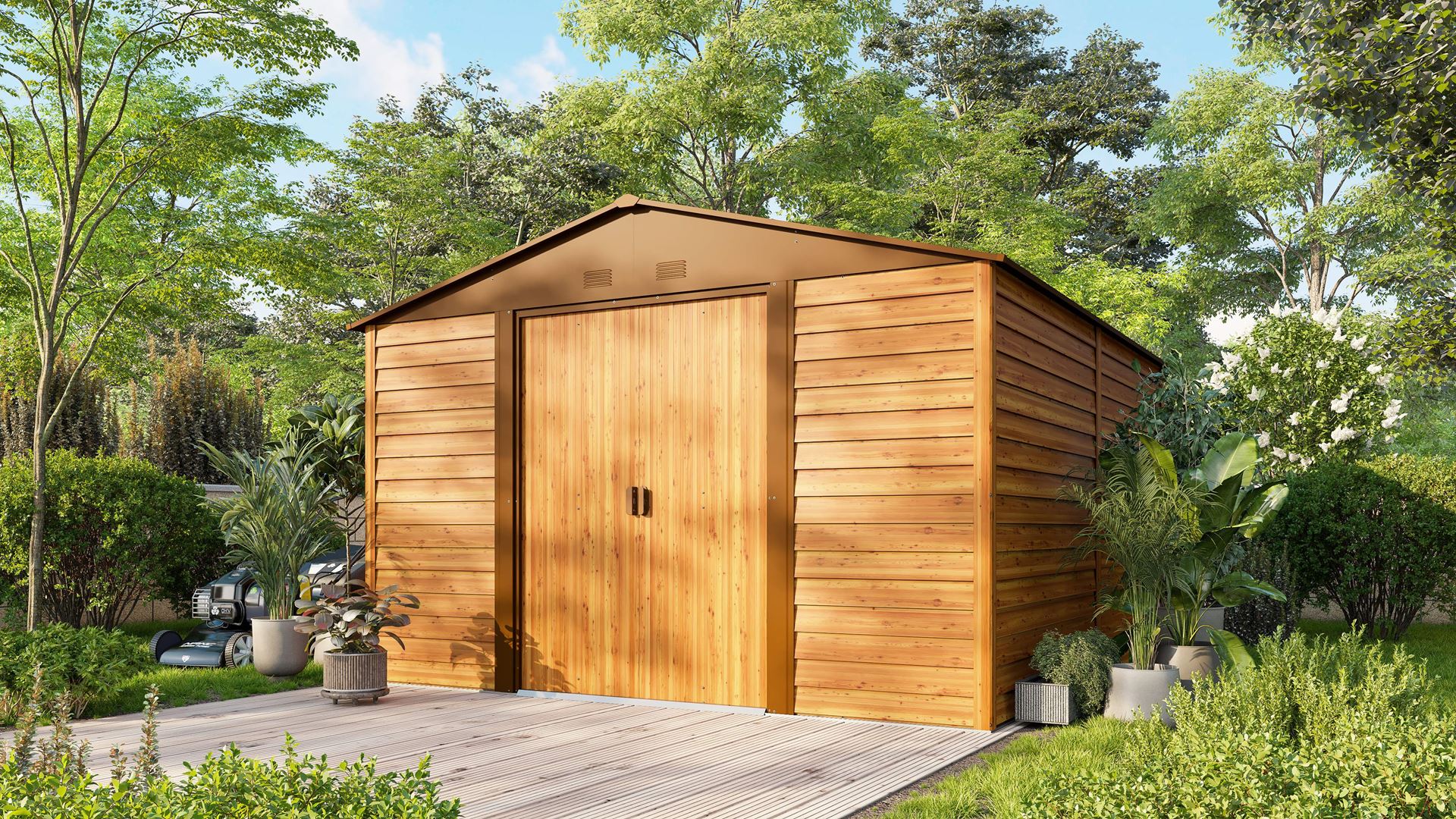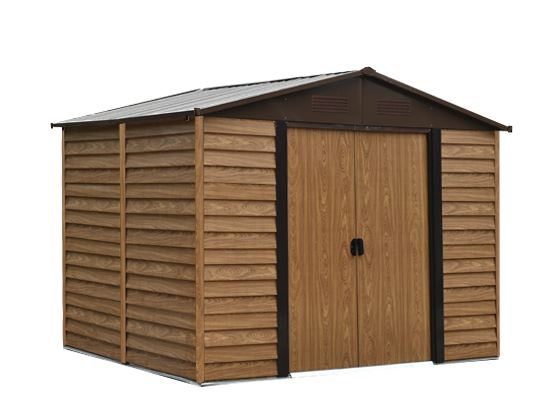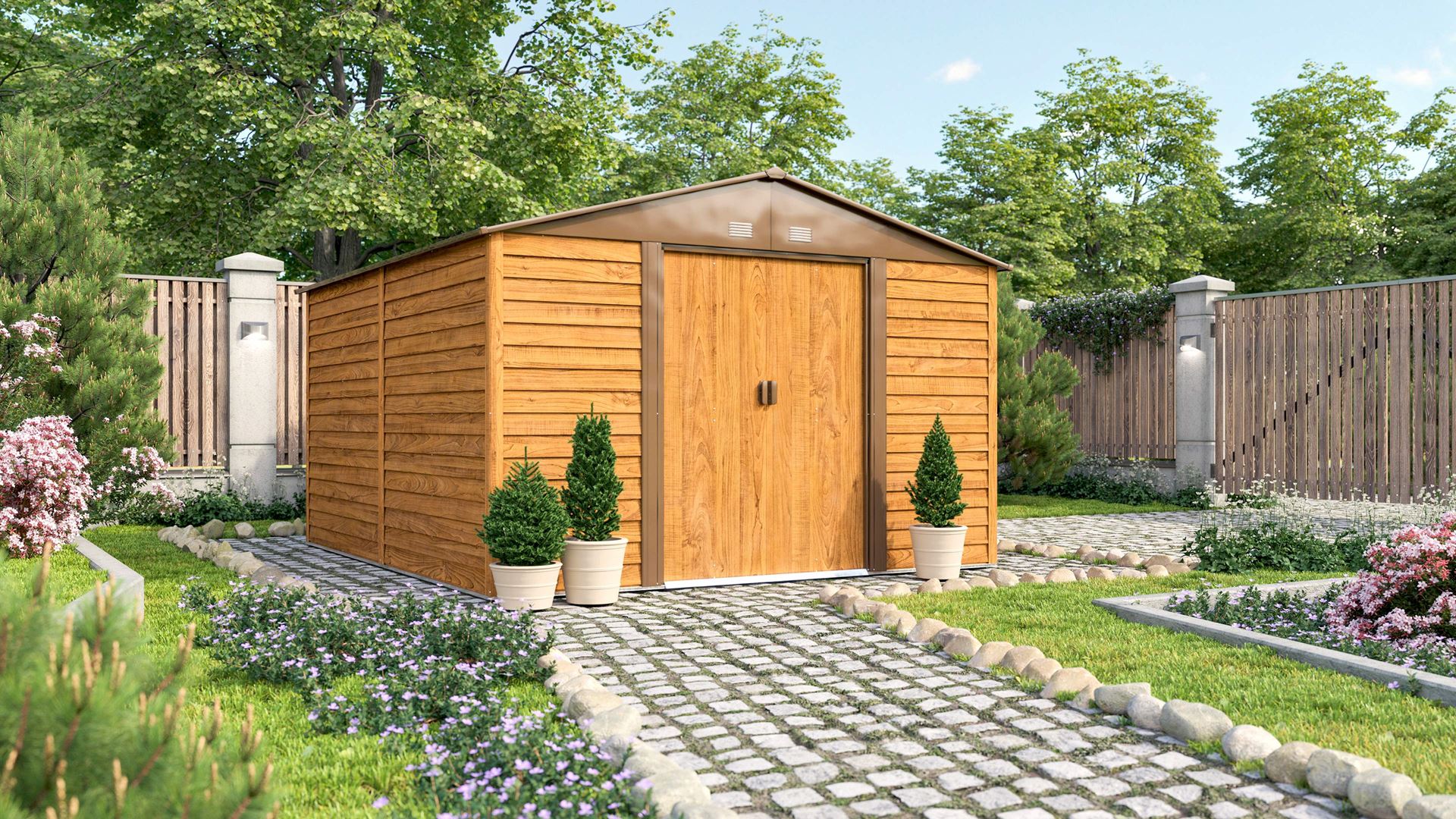 Moeten naast de zitmaaier ook de professionele barbecue, kruiwagen en aluminium ladder droog en veilig staan? Geen probleem met de gereedschapsschuur Frankfurt II!Met een vloeroppervlak van maximaal 11 m2 en een hoogte van meer dan 2 meter kan er ook in grotere behoeften aan ruimte worden voorzien. Daarbij overtuigt de Frankfurt II door zijn imposante verschijning. Royale constructie, dakgevels en gevels in blokhutstijl combineren tot een rustieke elegantie waarvan de aanblik een beetje doet denken aan een soort hut.De zijwanden, het dak en de vloerframeonderdelen van gegalvaniseerd plaatstaal zijn door een extra polyester coating betrouwbaar beschermd tegen roest en krassen. De dak- en vloerframeonderdelen zijn thermisch verzinkt en dus optimaal toegerust voor de hogere eisen in verband met grondcontact en weer. Ook de kleine onderdelen details zijn gemaakt van plaatstaal en de ventilatiesleuven zijn bijv. direct gestanst zodat er grotendeels wordt afgezien van het gebruik van kunststof. Ook hier wordt dus al vanaf heproductieproces het milieu ontzien en de uitstraling opgewaardeerd.De ruimtebesparende interne schuifdeuren kunnen ook bij sneeuw voor de schuur moeiteloos worden geopend. Zo kan de eigenaar van de schuur ook bij sneeuwschuiver en strooizout komen wanneer hij die het meeste nodig heeft.Gereedschapsschuur Frankfurt II onderscheidt zich door verschillende bruintinten en zijn zijwanden in houtdesign. Hij is in vier groottes (2,48 - 10,88 m2) verkrijgbaar en wordt gedemonteerd en zonder vloer geleverd.