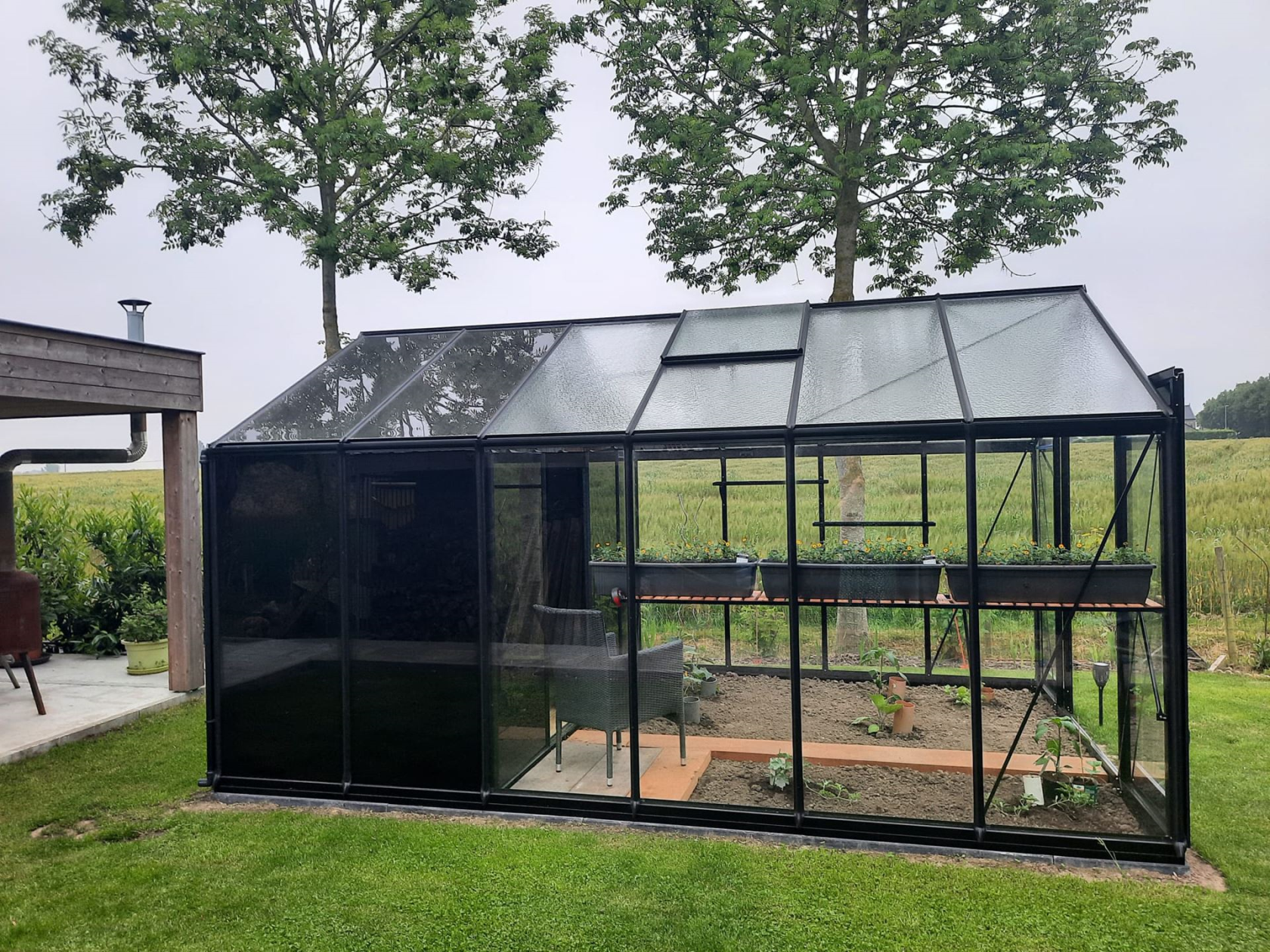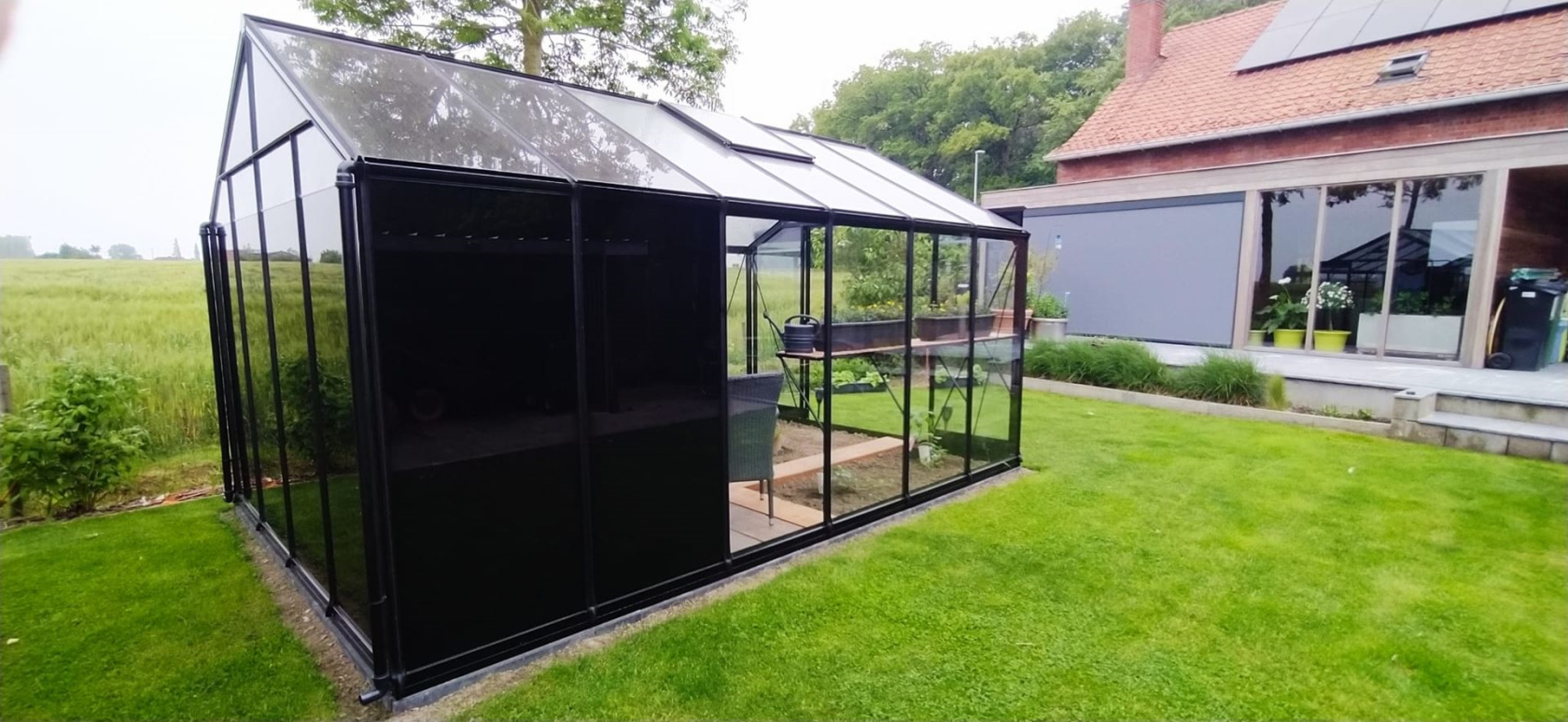 Deze serre heeft een luxueuze uitstraling dankzij zijn zwarte coating. De berging wordt afgesloten van het kweekgedeelte met een schuifdeur. Bovendien heeft de berging zwarte ramen waardoor de inhoud van de opslag minder opvalt! Je kan er dus lekker rommelen ;).