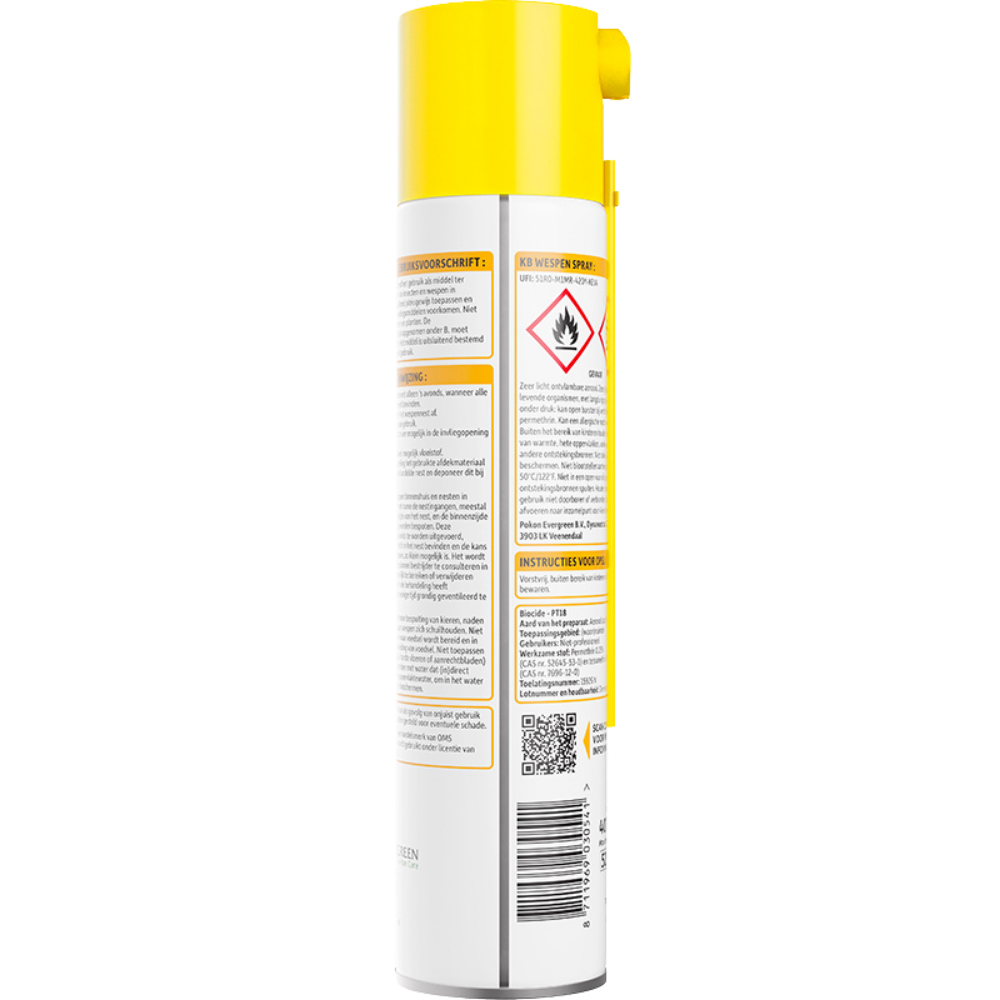 Gebruik de spray bij voorkeur ’s avonds, wanneer alle wespen zich in het nest bevinden. Schud de bus goed voor gebruik en steek de spuitspriet zo diep mogelijk in de invliegopening van het nest. Spuit vervolgens gedurende enkele seconden tot het nest voldoende gevuld is. Behandel daarnaast ook de directe omgeving zoals kieren en naden waar wespen zich schuilhouden.