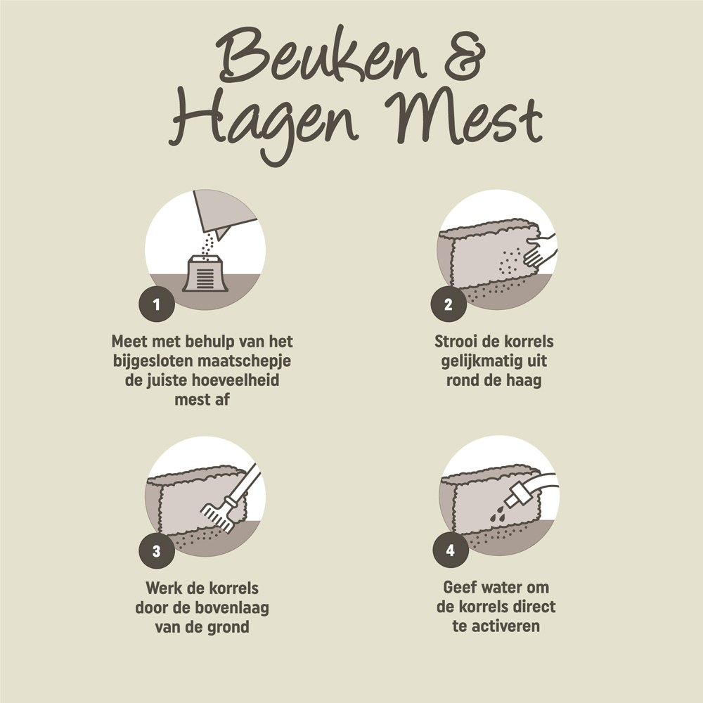 Gebruik deze mest van maart tot augustus en voor het beste resultaat is het aan te raden om je planten twee keer per jaar te voeden: in het vroege voorjaar en in de zomer. Het aanbrengen is eenvoudig; meet met het bijgesloten maatschepje de juiste hoeveelheid af en strooi de korrels gelijkmatig rond de haag. Werk ze door de bovenlaag van de grond en geef water om ze direct te activeren.