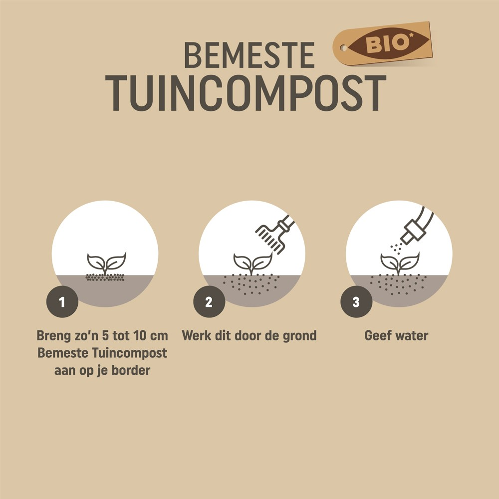 Breng een laag van ongeveer 5 tot 10 cm compost aan op de bodem en werk deze lichtjes in de bovenste grondlaag. Bij aanplanting meng je de compost met de bestaande aarde voor het beste resultaat. Geef na gebruik voldoende water zodat de voedingsstoffen goed vrijkomen.
