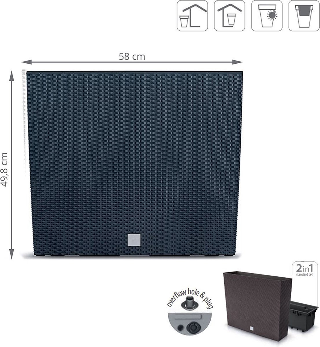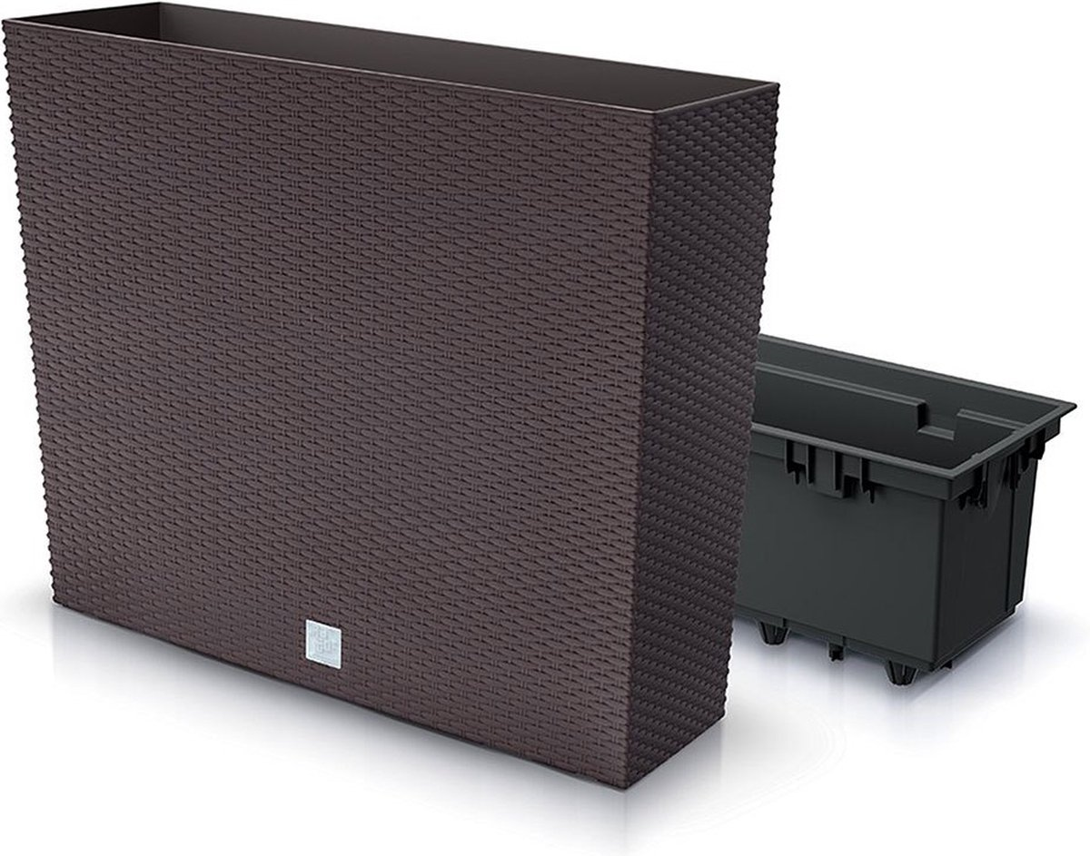 Creëer sfeer en privacy met de Rato Case Tower. Deze hoge, rechthoekige bloempot combineert functionaliteit met de populaire rattan look (wicker). Het lijkt gevlochten, maar is gemaakt van onderhoudsvriendelijk kunststof. 👌 Ideaal om een terras af te schermen, een zithoekje te creëren of als stijlvolle divider in een kantoorruimte. De chique antracietkleur past werkelijk overal bij. Hij wordt geleverd met een uitneembare binnenbak, wat het planten een stuk makkelijker maakt (en je hoeft de hele bak niet te vullen met aarde!).