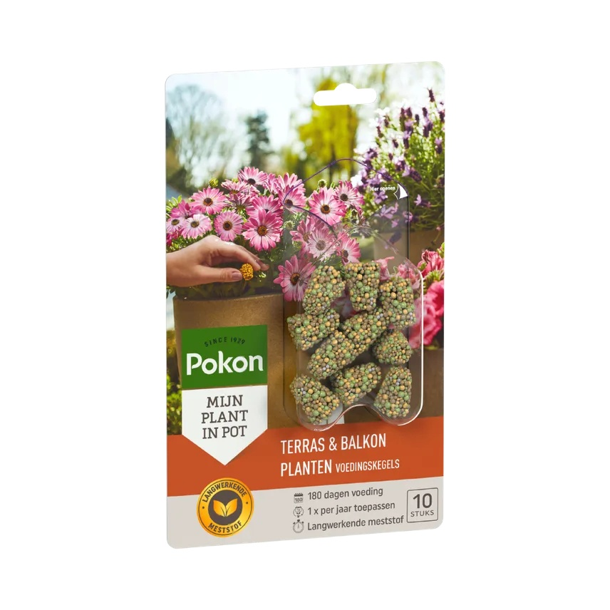 Planten in potten en bakken op je terras of balkon hebben het zwaar: ze kunnen hun wortels niet diep uitstrekken om voeding te zoeken. Geef ze daarom de ultieme boost met de Pokon Terras & Balkon Voedingskegels! Deze plantaardige kegels zijn verrijkt met een speciale biostimulant die jouw buitenplanten ijzersterk maakt. Het mooiste is het gemak: je plaatst de kegels één keer in het voorjaar en je planten zijn voor de komende 180 dagen (een heel buitenseizoen!) voorzien van een perfect afgemeten menu. ☀️