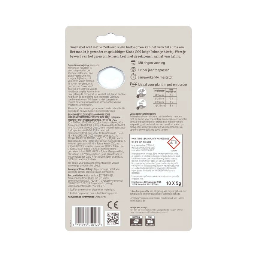 - Tip: Verdeel de kegels gelijkmatig langs de rand van de pot (maak een kuiltje van 5 cm diep) en geef na het plaatsen altijd water om de afgifte te starten.